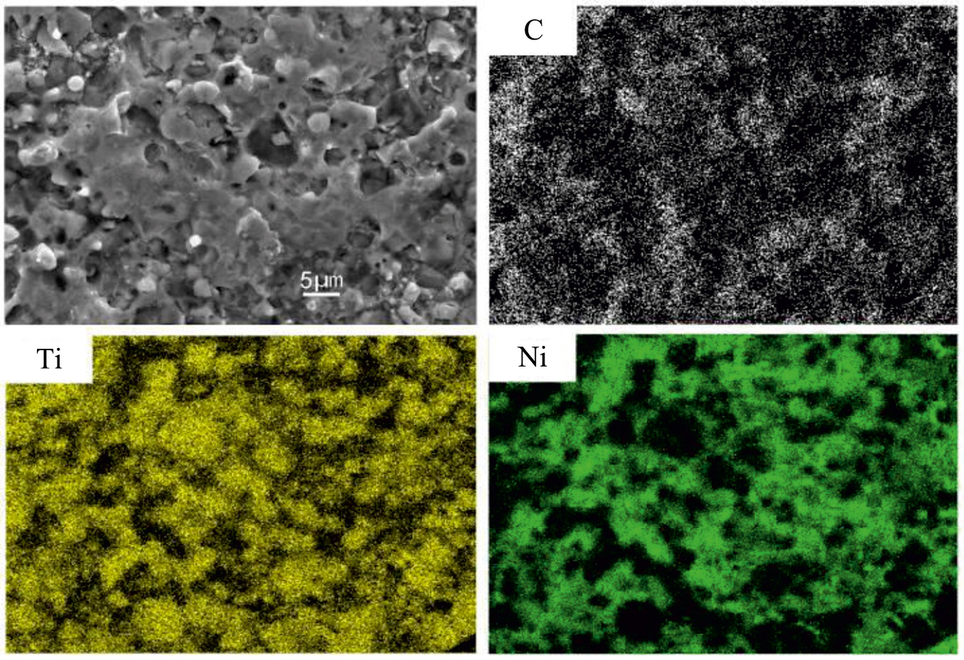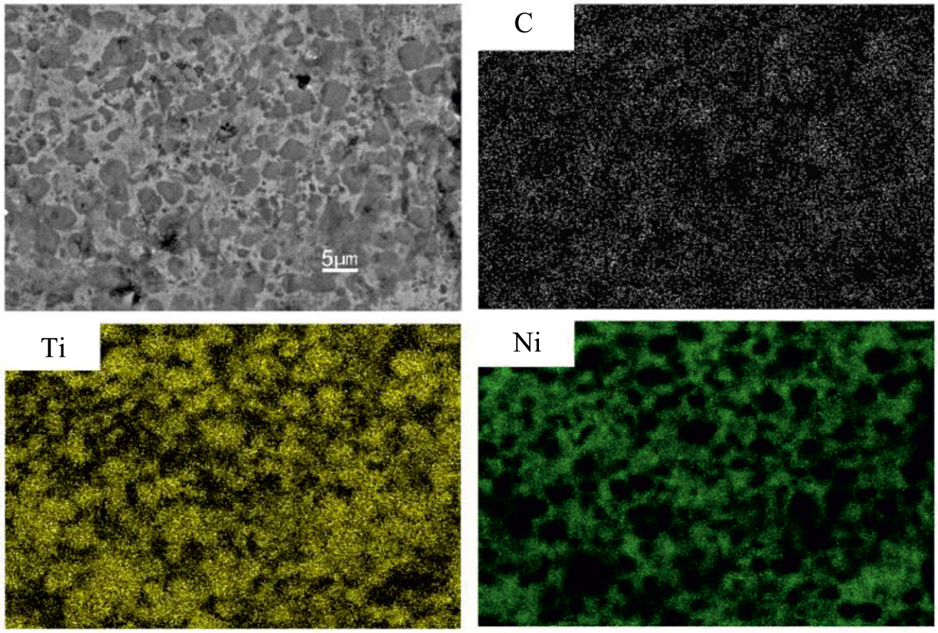 На рис. 1 представлены РЭМ-изображения образцов БВТС 50% TiC – 50% TiNi в исходном состоянии (а) и после воздействия МИП с различным числом импульсов (б–г). Микроструктура поверхности образца в исходном состоянии (рис. 1а) является гетерофазной, что подтверждается наличием карбидных зерен TiC (темные округлые участки) и интерметаллидной связки TiNi (светлые участки). Идентификация компонентов твердого сплава производилась методом анализа карт распределения титана, углерода и никеля по поверхности (рис. 2). Характерный размер карбидных зерен составляет ~1–5 мкм, а их распределение в связующей фазе является достаточно равномерным, что свидетельствует о качественном перемешивании порошковой смеси перед прессованием. Тем не менее на рис. 1а видны поры, образование которых происходит на этапе спекания. После однократного облучения МИП (рис. 1б) наблюдается оплавление поверхностного слоя БВТС, что сопровождается частичным размытием межфазных границ между карбидной и связующей составляющей БВТС. Увеличение числа импульсов облучения до 2 приводит к увеличению количества пор в поверхностном слое и возникновению микротрещин. Вероятно, поры образуются как в местах локализации приповерхностных пор, образовавшихся при перемешивании компонент сплава и спекании образцов, так и в местах неоднородного состава поверхностного слоя. Причиной образования микротрещин, вероятно, являются высокие значения растягивающих термомеханических напряжений, возникающих в поверхностном слое в условиях термоударного нагружения при воздействии ионного пучка и фазовая неоднородность твердого сплава. Пятикратное облучение МИП приводит к дальнейшему росту количества микротрещин и снижению размера образующихся пор, возможно из-за их частичного заполнения расплавом при многократном облучении.
