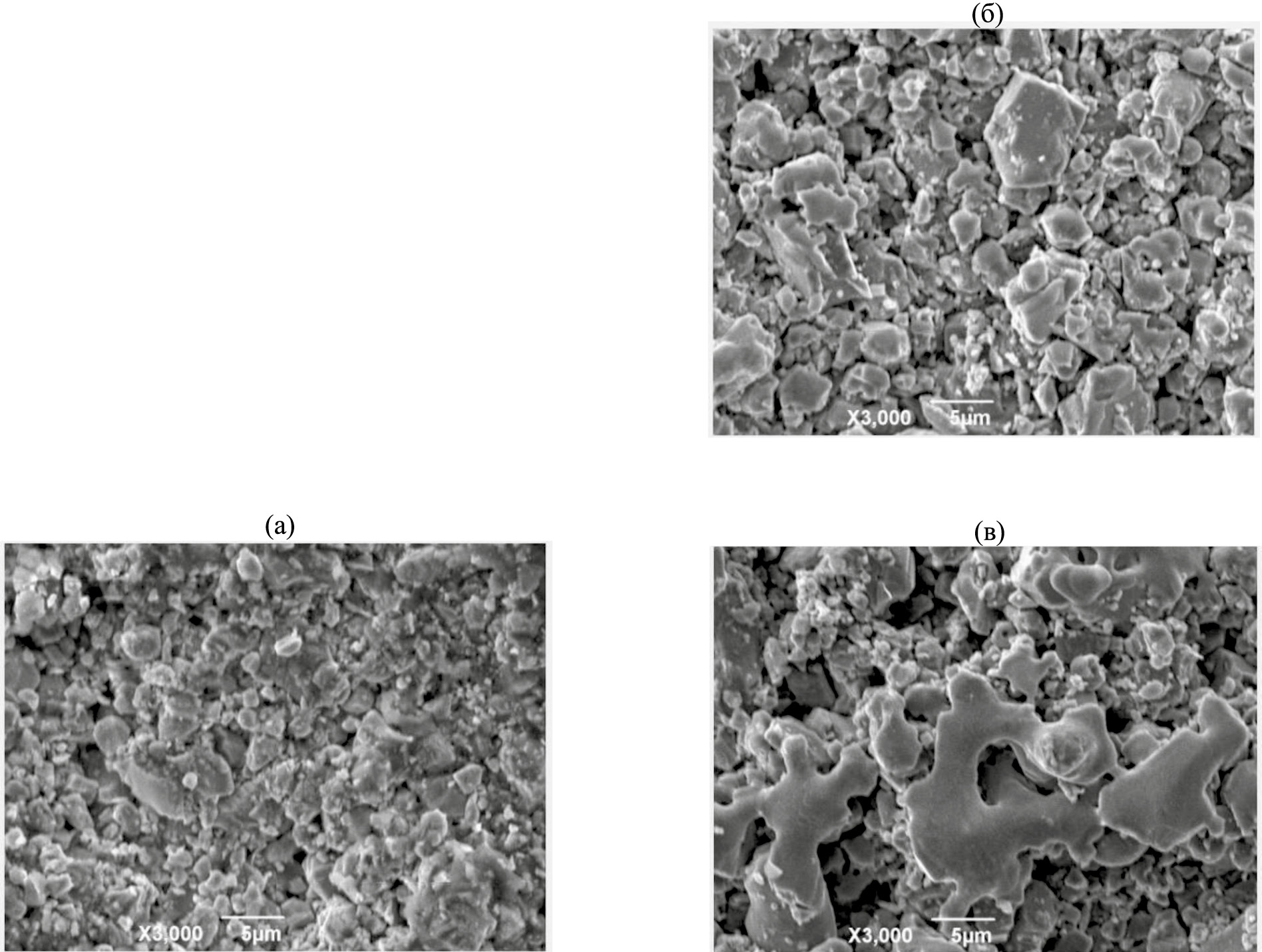 Рис. 4. РЭМ изображения поверхности спрессованного порошка TiC в исходном состоянии (а), после одного (б) и пяти (в) импульсов облучения МИП.