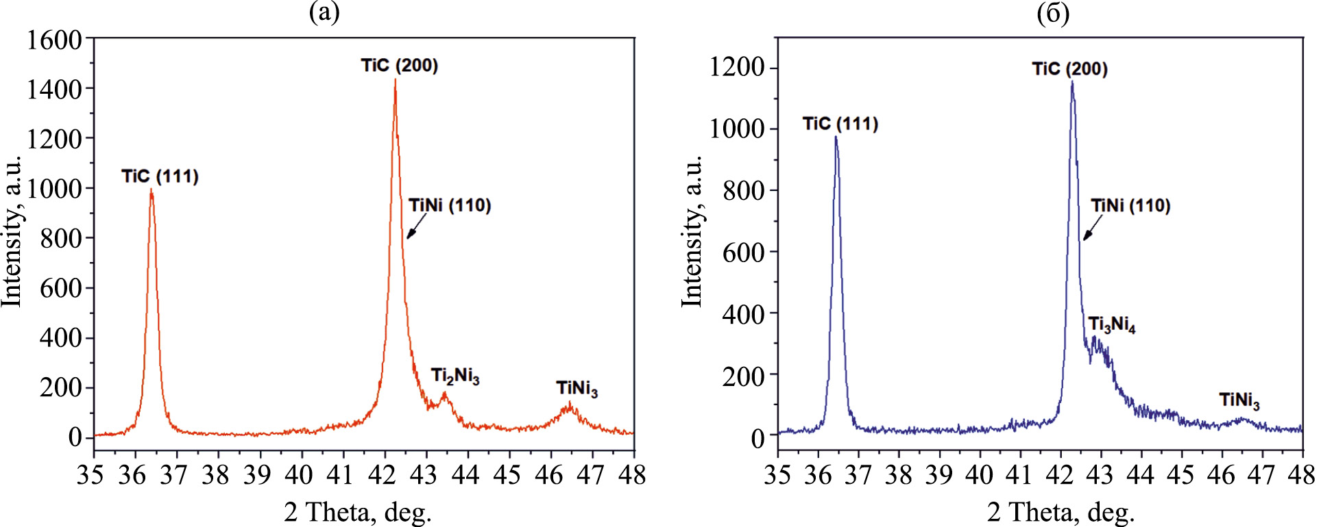 На рис. 5 представлены фрагменты дифрактограмм БВТС в исходном состоянии (а) и после однократного облучения МИП (б). На представленных дифрактограммах присутствуют рефлексы, отвечающие карбиду титана TiC, никелиду титана TiNi, и интерметаллидным фазам с избыточным содержанием никеля (Ti3Ni4, Ti2Ni3, TiNi3). Наличие последних связано с перераспределением атомов титана из связки в карбидные зерна на этапе спекания образцов и является нежелательным, поскольку приводит к охрупчиванию БВТС [8]. На дифрактограмме облученного образца наблюдается значительное снижение интенсивности рефлекса, отвечающего фазе TiNi3 (~ в 2.3 раза). Кроме того, на дифрактограмме исходного образца наблюдается рефлекс Ti2Ni3, а на дифрактограмме облученного – Ti3Ni4. Вероятнее всего, снижение количественного содержания TiNi3 и отсутствие обогащенной никелем фазы Ti2Ni3 в поверхностных слоях модифицированного твердого сплава связано с процессом высокотемпературной сегрегации титана к поверхности БВТС при облучении. Подобный эффект при облучении интерметаллидных соединений никеля с титаном наблюдали в работе [9]. Удаление обогащенных никелем фаз может положительно сказаться на механических свойствах БВТС.