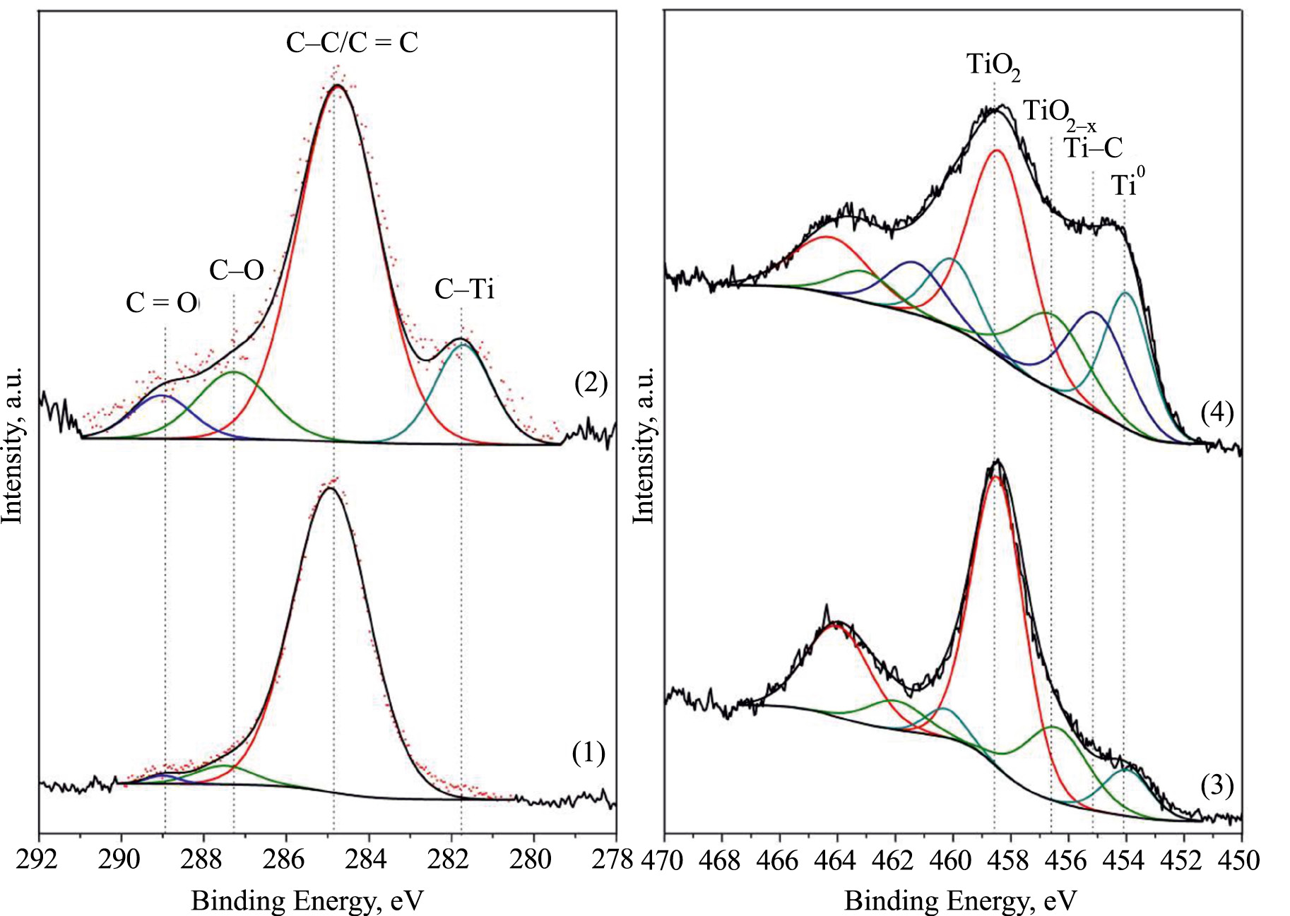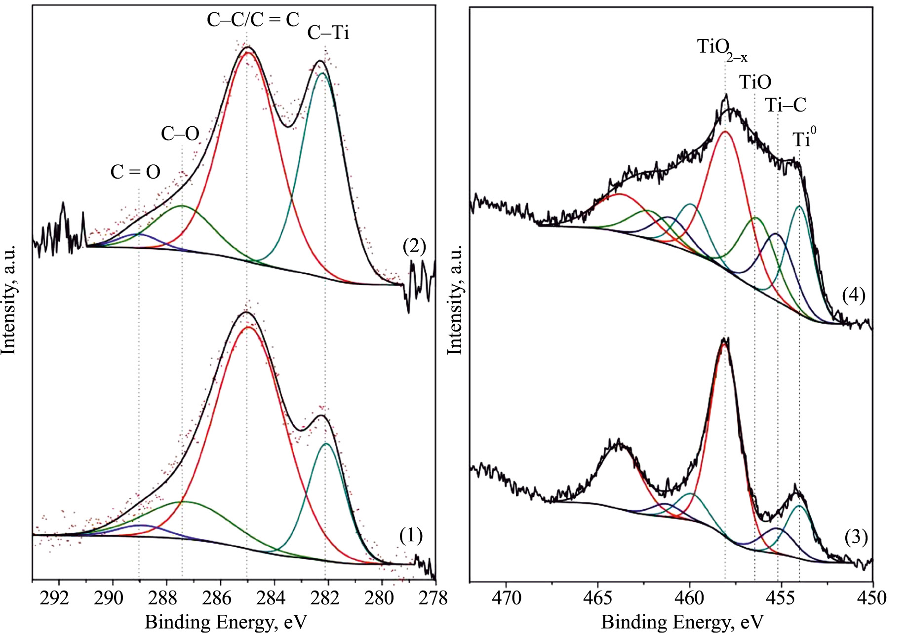 На рис. 7 (кривая 1) представлен XPS C. 1s спектр, измеренный на исходной поверхности титанового образца после хранения в условиях сверхвысокого вакуума (48 часов) и непродолжительного ионного травления для удаления поверхностных атмосферных загрязнений. Видно, что в спектре исходного образца, присутствует интенсивный компонент, отвечающий свободному углероду, а также слабоинтенсивные высокоэнергетические компоненты, связанные с углеродом в составе С-О/C=O связей. В С 1s спектре облученного титана (рис. 7 кривая 2) наблюдается наличие компонента на энергии связи ~282 эВ, отвечающего углероду в составе карбида титана.