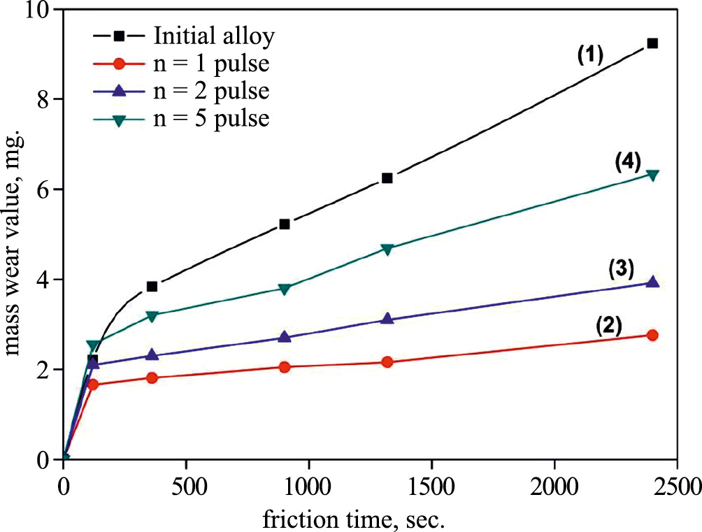 Примечательно, что наименьшей скоростью износа в начальный период времени (первая точка) характеризуется однократно облученный МИП образец. Это может быть связано с формированием TiC связей в поверхности образца при облучении, что подтверждается данными РФЭС. Величина массового износа образца, облученного МИП с числом импульсов (n) = 5 существенно выше, что может быть связано с увеличением количества микротрещин на его поверхности в результате модификации.