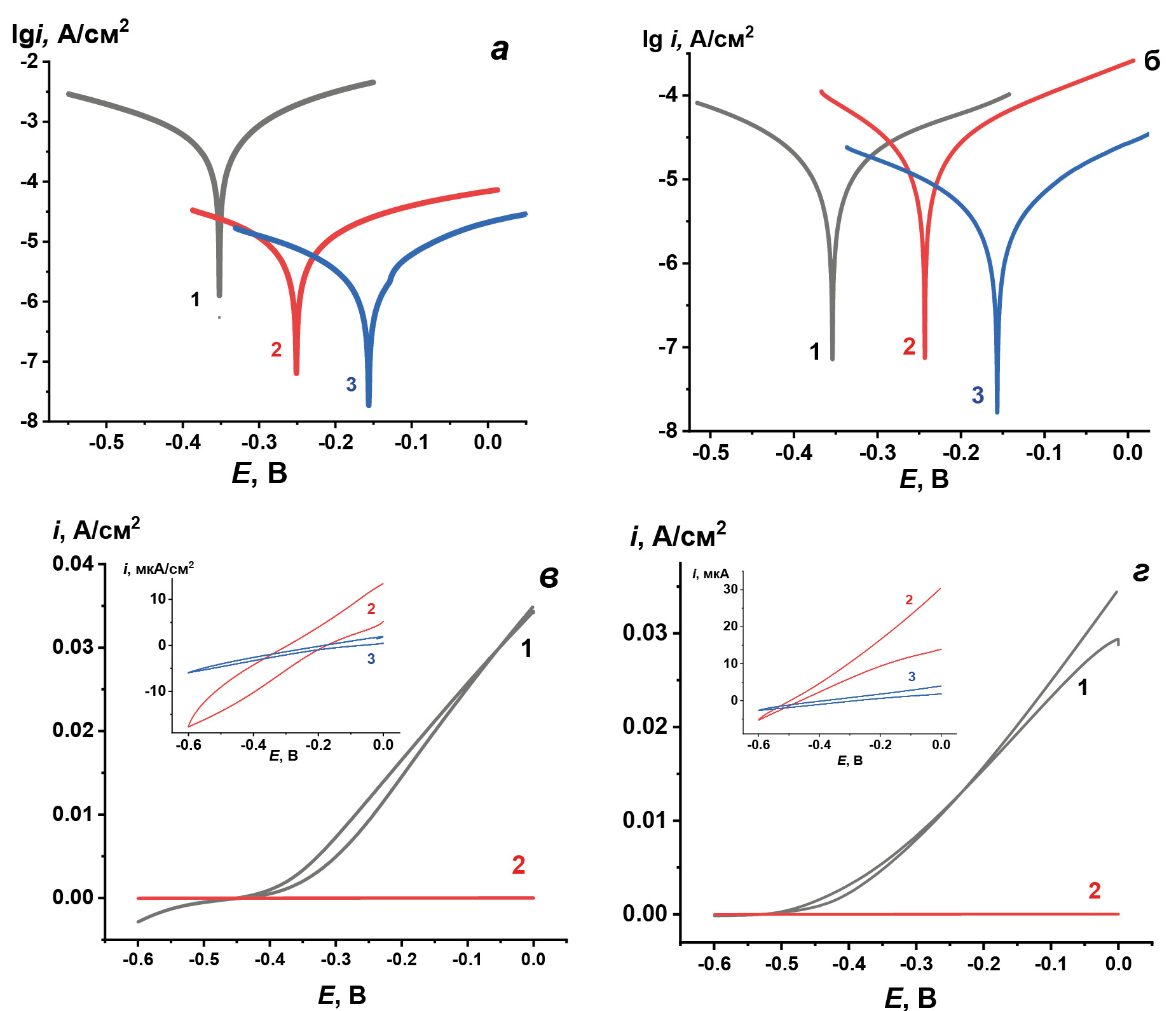 Рис. 2. Потенциодинамические поляризационные кривые образцов У8А (1); У8А–АЛ (2), У8А–АЛ–ZnO (3) в 0,1 М HCl (а, в) и 0,6 М NaCl (г, д), полученные при анодной развертке потенциала (а, б) и в режиме циклической развертки (в, г).