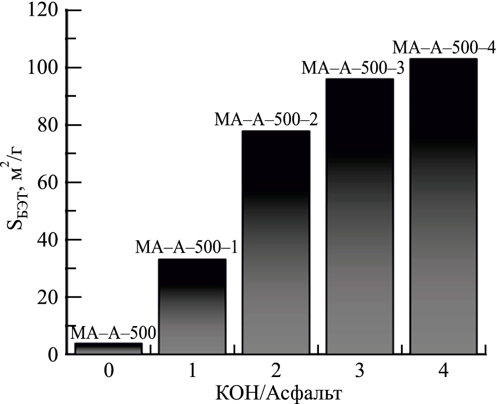 Текстурные характеристики синтезированных образцов приведены в табл. 2. Для сравнения в таблице представлены опубликованные ранее основные показатели пористой структуры образцов, полученных без дополнительной стадии механической активации [17]. Изменение соотношения КОН:асфальт от 1 до 4 приводит к постепенному увеличению удельной площади поверхности и объема пор до 50%. Проведение МА асфальта с КОН увеличивает показатели пористой структуры на 30% в сравнении с образцами, приготовленными ранее [17]. Дополнительное стимулирование развития пористости происходит не только за счет тонкого измельчения и однородного смешения реагентов. Можно предположить, что формирование пористой текстуры начинается на стадии механической активации в планетарной мельнице. При этом увеличивается число точечных контактов, осуществляется их постоянное обновление, реализуются процессы размножения и миграции дефектов в объеме твердого тела, причем подвижность частиц смеси может быть достаточной для перемешивания вещества на молекулярном уровне. Это может способствовать более эффективному развитию пористой структуры углеродных материалов при последующей высокотемпературной активации. В связи с этим предположением, была исследована пористая структура образцов, полученных сразу после МА асфальта с КОН. Также для сравнения была проанализирована текстура асфальта после МА без добавления КОН. Видно, что при совместной механической активации асфальта и КОН с ростом содержания КОН текстурные характеристики SБЭТ и Vадс увеличиваются в несколько раз по сравнению с карбонизованным асфальтом после МА без КОН (MA-A-500). На рис. 2. показана зависимость SБЭТ образцов после механической активации от соотношения КОН/асфальт. Полученные результаты свидетельствуют о формировании первичной пористости после совместной МА асфальта и КОН.