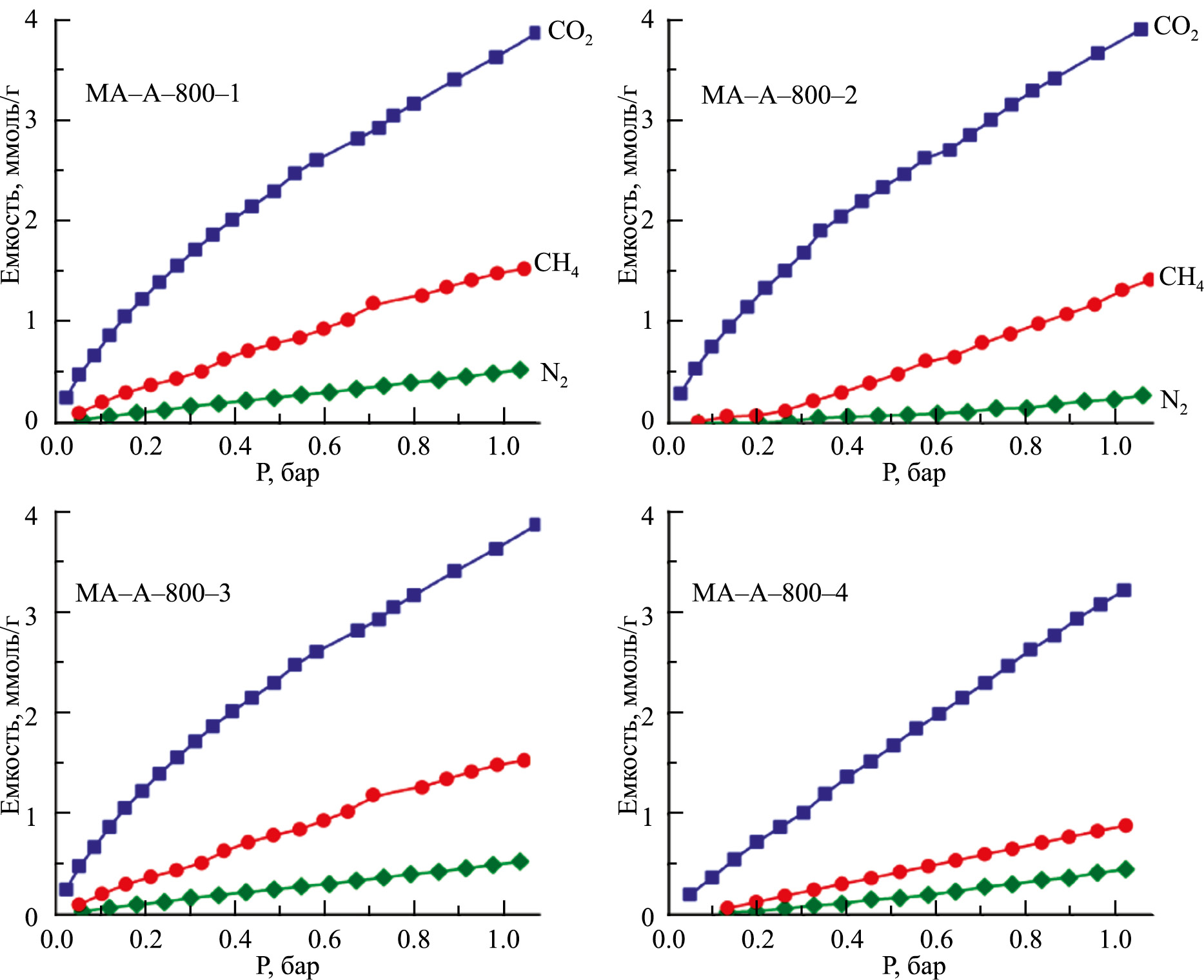 Изотермы адсорбции СО2, CH4 и N2 были измерены в диапазоне давлений 0.03–1 бар при температурах 0°C и 25°C с использованием сорбционного анализатора Sorptomatic 1900 (Carlo Erba Instruments, Италия). Перед измерениями образцы дегазировали при 300°C в течение 3 ч. Селективность адсорбции газов CO2/N2, CH4/N2, CO2/CH4 рассчитывали с применением теории идеального адсорбированного раствора (IAST) [23].