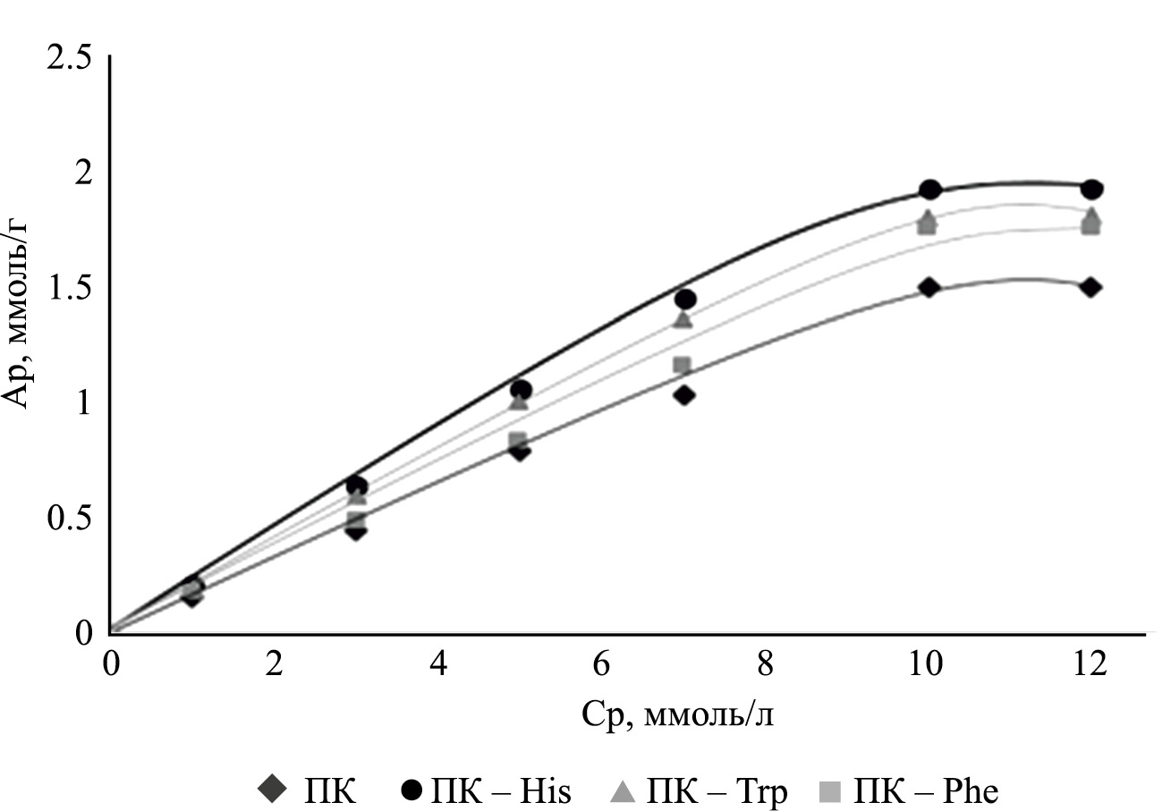 Таким образом, путем модифицирования яблочного пектина ароматическими аминокислотами (L-гистидин, L-триптофан, L-фенилаланин) получены новые биосорбенты, обладающие высокой сорбционной активностью по отношению к ионам Mn2+ по сравнению с нативным пектином. Обнаружено, что модифицированные пектины превосходят нативный пектин по сорбционной емкости на 12–20%. Сорбционная активность модифицированных пектинов по отношению к ионам Mn2+ увеличивается в ряду: ПК–His > ПК–Trp > ПК–Phe, что коррелирует с изменением удельной площади поверхности, размером частиц и констант устойчивости. Показано, что зависимость величины сорбционной емкости от равновесной концентрации ионов Mn2+ подчиняется уравнению Ленгмюра (R2 = 0.973–0.999), что соответствует образованию мономолекулярного сорбционного слоя на поверхности МП. Подобраны оптимальные условия проведения процесса сорбции ионов Mn2+ исследуемыми сорбентами, при которых достигаются высокие показатели сорбционной активности (время 60 мин, рН ~4.0–6.0, Т = 273 К). Согласно рассчитанным термодинамическим параметрам процесса сорбции ионов Mn2+модифицированными пектинами установлено, что сорбция представляет собой экзотермический процесс, который можно рассматривать как химическую адсорбцию.