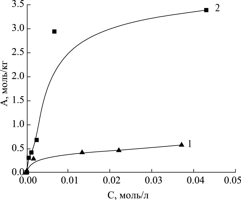 Для получения изотерм сорбции в серию пробирок помещали навески сорбента массой (m) 0,1 г, заливали их 10 мл (V) водного раствора сульфата меди с начальными концентрациями (С0) 5⋅10–4–5⋅10–2 моль/л и выдерживали до достижения состояния равновесия при температуре 273 К. Затем раствор отделяли от сорбента фильтрованием и определяли в нем равновесную концентрацию ионов металла (С) методом атомно-абсорбционной спектроскопии на приборе “210VGP”.