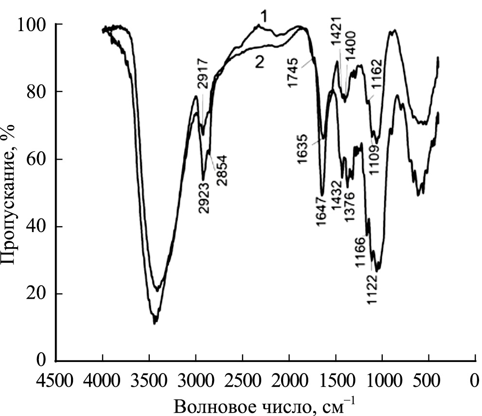 Рис. 4. ИК-спектры хлопковой целлюлозы (1) и модифицированного сорбента (2).