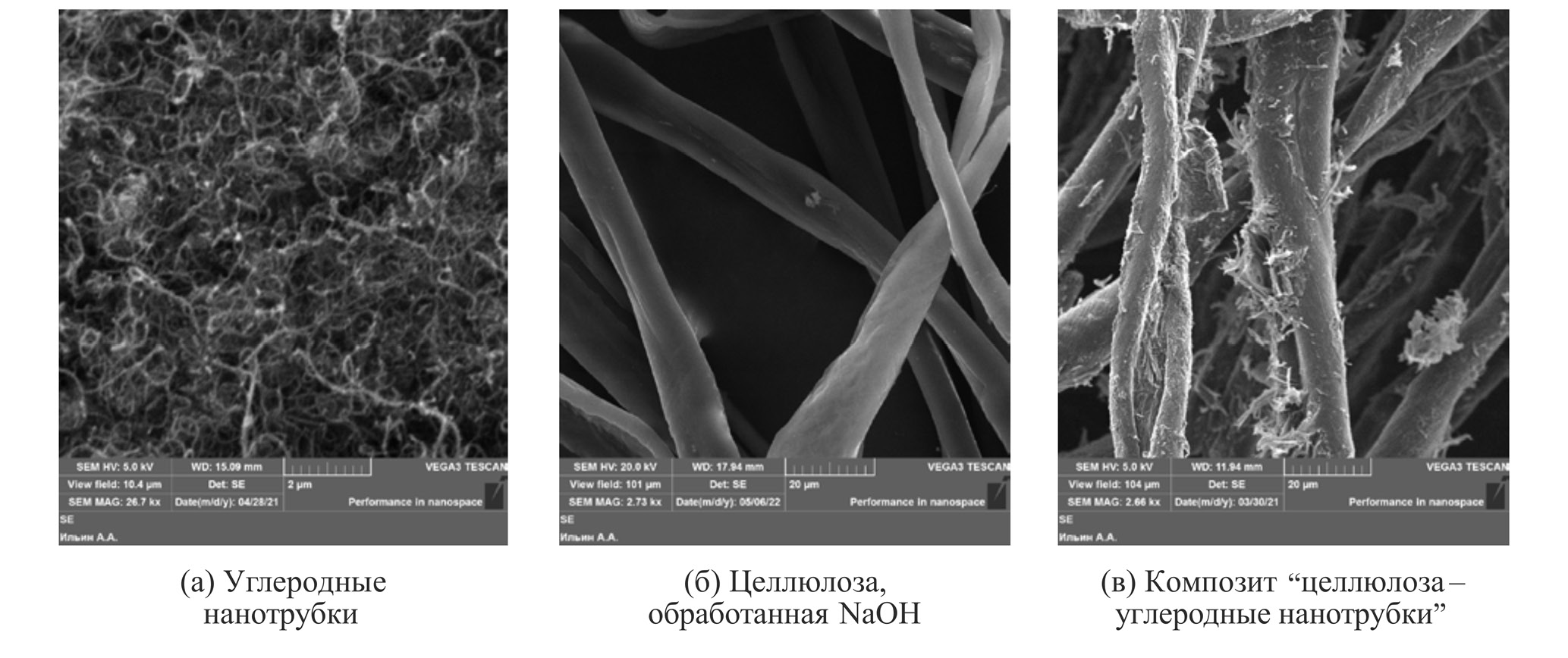 Рис. 5. СЭМ-изображения поверхности УНТ, целлюлозы и композита “целлюлоза – УНТ”.