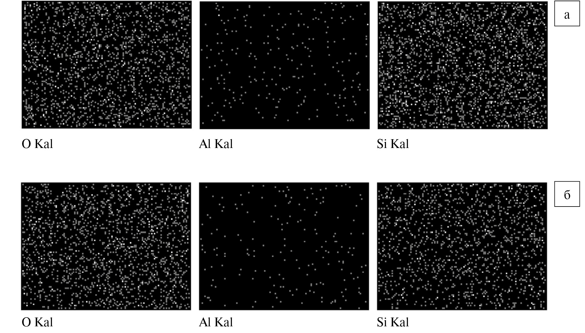 Рис. 2. Поверхности свежего (а) и отработавшего 33 мес (б) силикагелевых адсорбентов АСМ 3 на УПГТ в характеристическом излучении кислорода, алюминия и кремния.