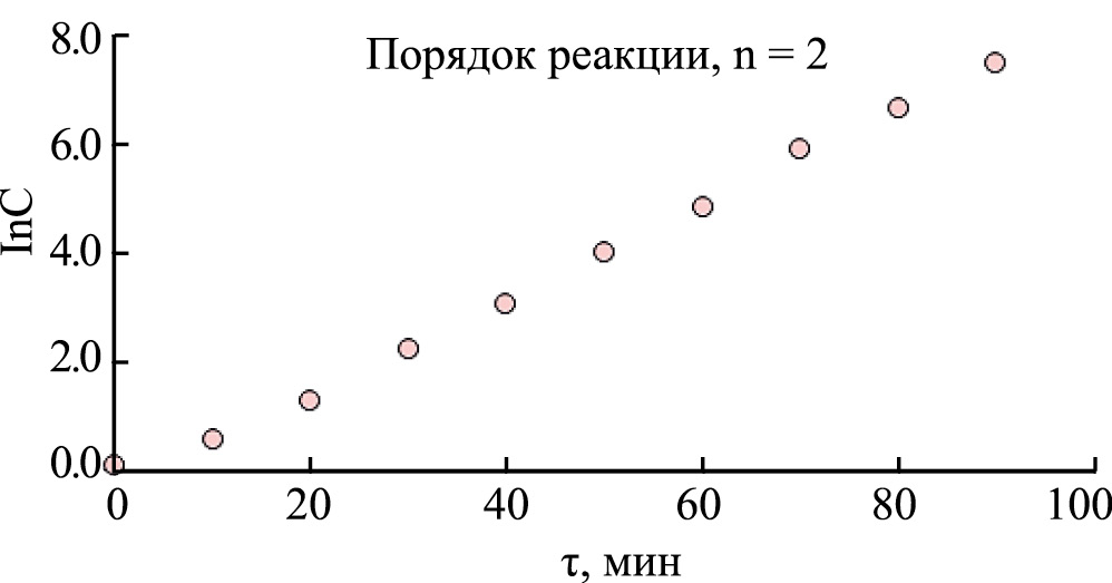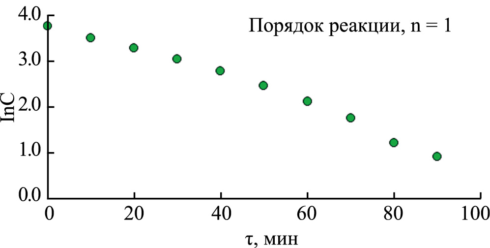 Весьма интересным представляла оценка кинетических характеристик конверсии метанола на адсорбентах в зависимости от их физико-химических характеристик (табл. 1). Были изучены зависимости содержания метанола от времени нахождения реакционной смеси в реакторе при 160°–290°С на адсорбентах АСМ, АСМ ВС, BASF KC-Trockenperlen H, BASF KC-Trockenperlen WS и НИАП-АОС. Каталитические превращения на адсорбентах АСМ 1 и НИАП-АОС (на основе оксида алюминия) оценили по зависимости логарифма концентрации метанола и обратного его содержания от времени нахождения реакционной смеси в реакторе при 290°С, скорости потока насыщенного метанолом азота 400 мл/мин и атмосферном давлении (рис. 4, 5). Полученные зависимости логарифма содержания метанола от времени контакта в реакторе при 160°, 200°, 240° и 290°С на адсорбентах АСМ, АСМ ВС, BASF KC-Trockenperlen H и BASF KC-Trockenperlen WS соответствовали первому порядку реакции, а для адсорбента на основе оксида алюминия НИАП-АОС – второму.