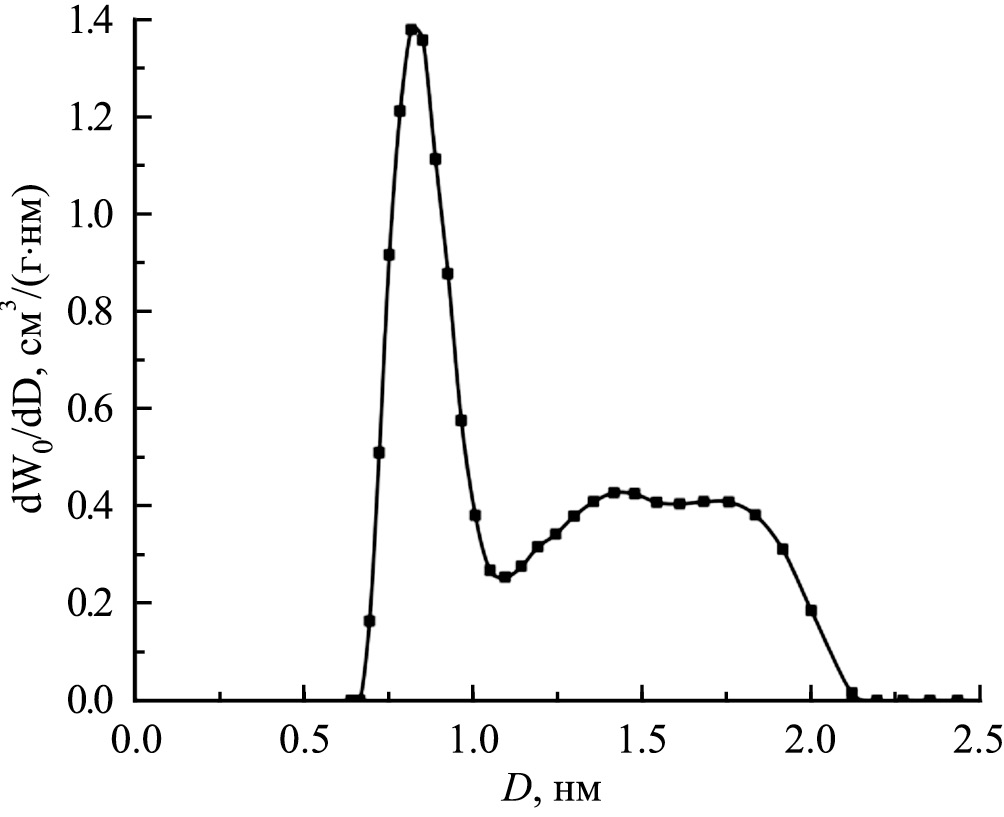 Пересчет на бензол осуществляли с использованием коэффициента подобия βN2 = Е/Е0 = 0.33; эффективную полуширину (радиус) микропор определяли по ТОЗМ, х0 = 12/Е0 (нм) [11].