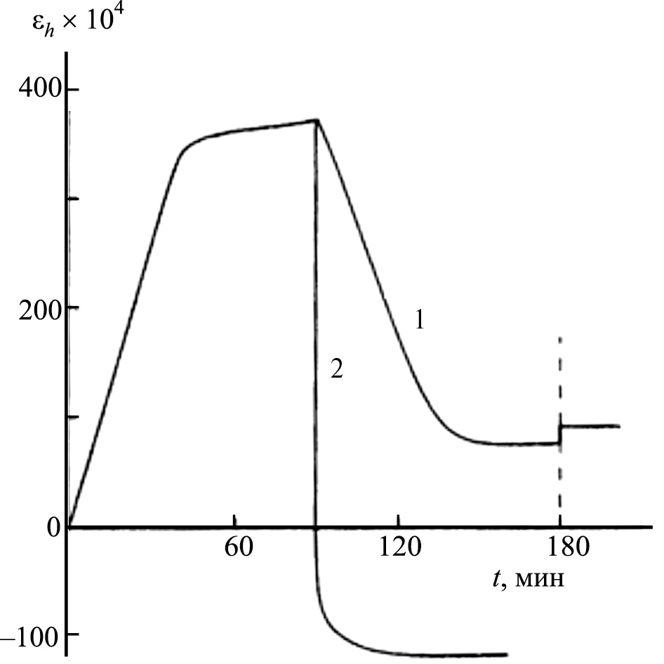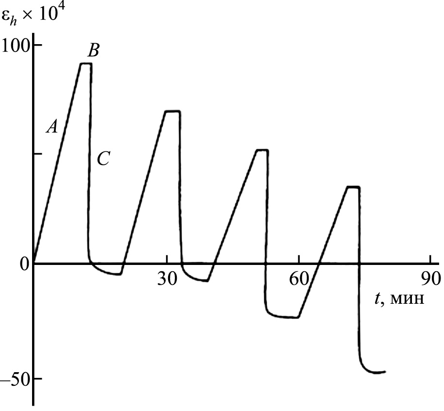 Далее цикл ЭХН-ЭХД (плюс ступень С, рис. 1) несколько раз повторялся. При этом от цикла к циклу постоянно наблюдался, хотя и с уменьшением, рост εh. В конце 3-го цикла суммарное остаточное εh составило 59×10–4 (то есть 59 мкм на 1 см длины образца). При этом было установлено, что отжиг в конце каждого цикла не меняет хода кривых и величину εh по сравнению с экспериментами, где такого отжига не проводилось.