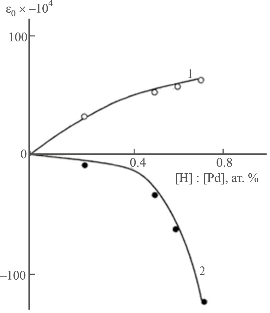 Более полная зависимость ε0 от концентрации введенного в Pd водорода во время ЭХН для обоих рассматриваемых циклов приведена на рис. 4. Если при ЭХД с ростом соотношения H:Pd (рис. 4, кривая 1) ε0 увеличивается по закону (Н:Pd)0,5, асимптотически приближаясь к некоторому предельному значению, то в случае термодесорбции остаточное укорочение Pd (рис. 4, кривая 2) возрастает приблизительно по закону (H:Pd)2 и, особенно, резко при соотношении (Н:Pd) > 0,46.