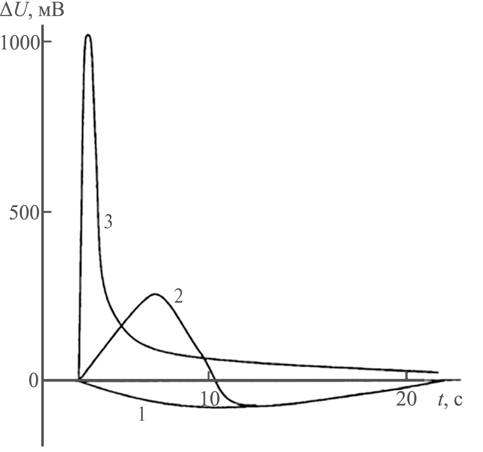 Рис. 5. Кинетика выделения и поглощения энергии при сбросе образцов Pd в термостат калориметра: 1. ненаводороженный, 400°С; 2 – наводороженный до H:Pd = 0,72, 400°С, вакуум; 3 — наводороженный до Н:Рd = 0,46, 600°С на воздухе.