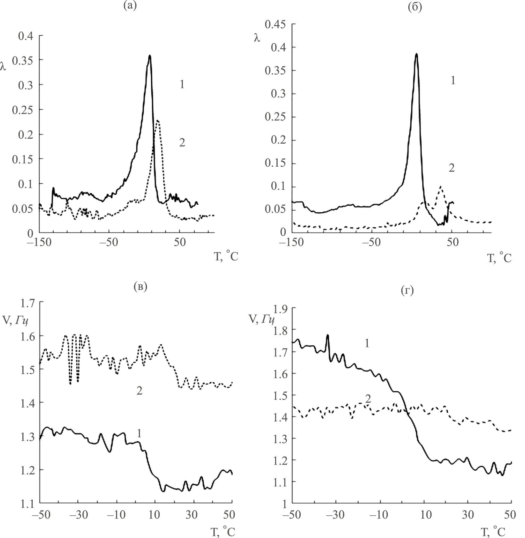 Рис. 4. Эффект фталоцианината на интенсивность α-релаксации λ (а, б) и частоту колебательного процесса ν (в, г) для свободных пленок А (а, в) и М (б, г): кривые 1 – с модификатором; кривые 2 – без него.