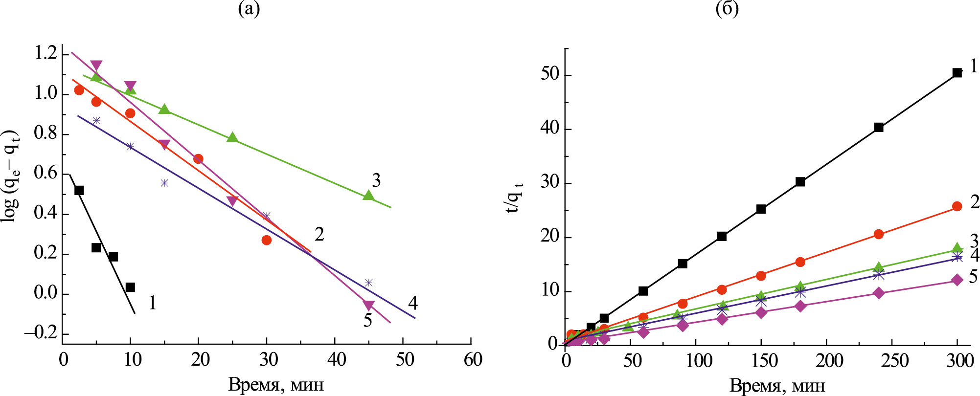 Рис. 7. Линейные графики моделей псевдопервого (а), псевдовторого порядка (б) при концентрациях красителя: 1 – 25 мг/л, 2 – 50 мг/л, 3 – 85 мг/л, 4 – 120 мг/л, 5 –200 мг/л.