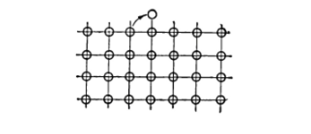 Френкель обратил внимание на механизм образования “дырок” (вакансий) в кристаллической решетке, определяющий образование поверхностных вакансий (рис. 1). Он показал, что если энергия связи с одним соседом равняется U1, то энергия связи с оставшимися пятью соседями равна 5U1. Поэтому чаще, чем акты обычного полного испарения, на поверхности кристалла будут происходить акты освобождения одного из наружных узлов без отрыва соответствующего атома от поверхности кристалла, при этом на исходном месте образуется “дырка”. Тем самым, Френкель показал возможность сосуществования поверхностных вакансий и адсорбированных атомов (адатомов) на поверхности кристалла. Этот механизм разрушения атомных связей с образованием поверхностных вакансий и адатомов использован автором в вакансионной термодинамической модели (ВТМ) поверхностного слоя металлов в виде равновесия [12]: