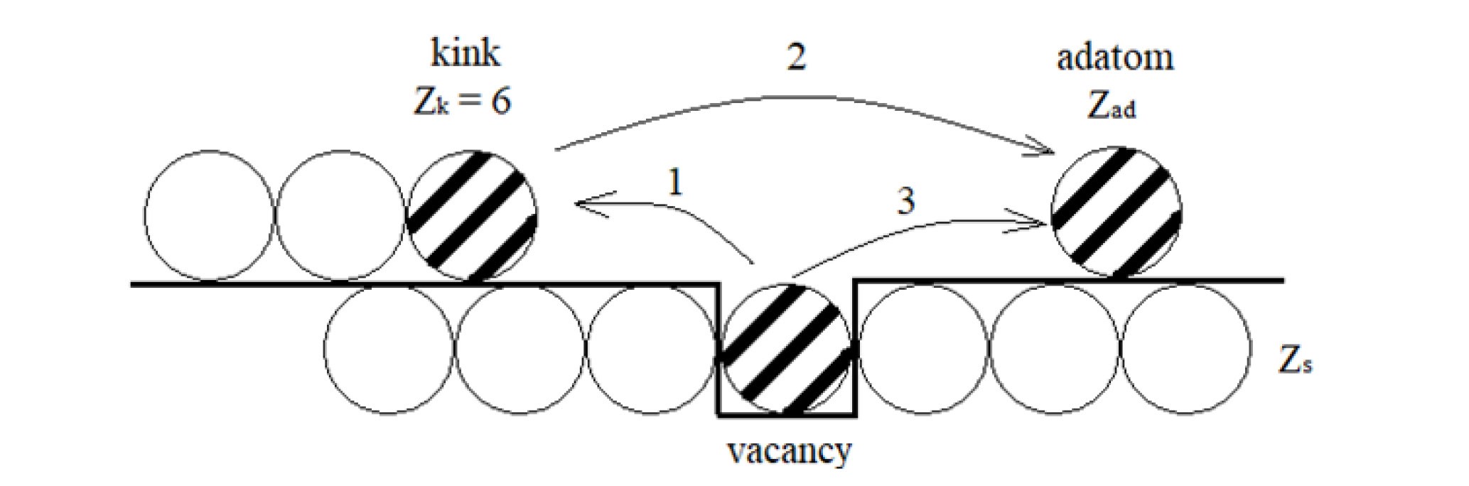 Основная идея ВТМ состоит в том, что при нагреве первоначально идеального кристалла с термодинамической вероятностью возникает структура поверхности с минимальной энергией. В этом смысле, оказалась полезной TLK-модель (Kossel и Stransky) свободной поверхности ГЦК-кристалла (рис. 2) со структурными элементами (ступени с изломами (кинки) и адатомы). Эта модель определяет число ZS ближайших соседей атома для низкоиндексных граней (111), (100) и (110). Соответственно, в заполненном атомном поверхностном слое (ПС) для данной грани число ZS = 9, 8 и 7, а адатом – координационное число Zad = 3, 4 и 5. Согласно ВТМ, полное изменение энергии атома, переходящего из объема кристалла на его поверхность выражается уравнением: