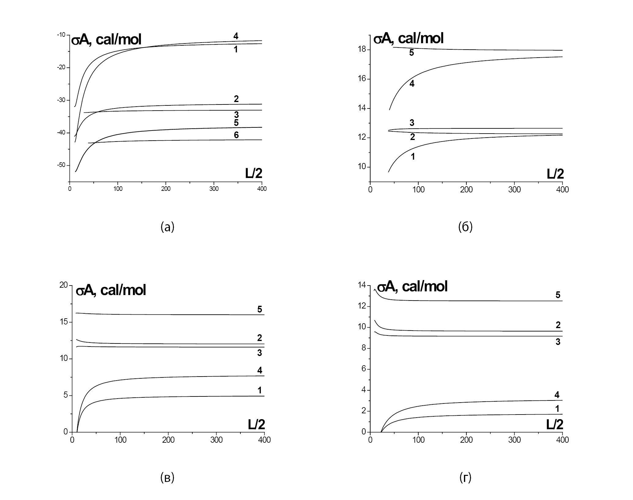 Ниже на рис. 6–8 сравниваются размерные зависимости ПН куба со стороной L, сосуществующего с собственным паром. На рис. 6а для однокомпонентной s2 (4–6) и двухкомпонентной s3 (1–3) системы приведены размерные зависимости ПН по определению 1 куба со стороной L при паро-жидкостном расслаивании в модели куба г) на грани куба (1, 4), локальное в центре ребра (2, 5), локальное в центре вершины (3, 6).