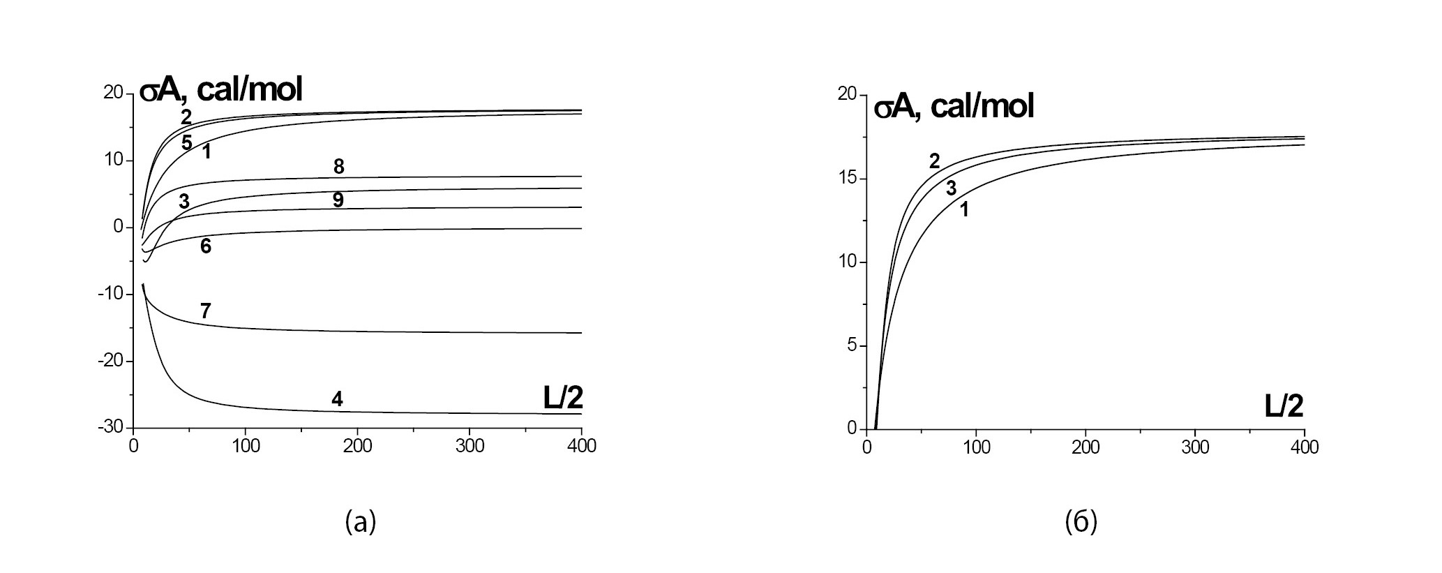 ПН на ребре, чей избыток отнесен к грани, (1) убывает с уменьшением стороны куба. ПН в вершине, чей избыток отнесен к ребру, (2) увеличивается с уменьшением стороны куба. Два разных поведения кривых связано с наличием двух факторов, влияющих на ход кривых. Первый фактор связан со сближением ПН в различных областях с уменьшением размера L (см. рис. 7), т.е. разница ПН между разными областями убывает. Второй фактор связан с тем, что в выражениях (10б–в) вклады химпотенциалов от разных областей взвешиваются на одни и те же весовые функции только от одной из областей: в (10б) – это весовые функции области ребра, а в (10в) – области вершин. Таким образом, второй фактор может нарушать результат первого фактора. В областях ребер и вершин весовые функции меняются подобным образом в переходной области, поэтому второй фактор не искажает результата первого фактора и кривая 2 дает уменьшение рассматриваемой функции по модулю с уменьшением L. В области граней же характер весовых функций отличается: все монослои переходной области имеют равные веса. И в результате того, что химпотенциалы в области граней в (10б) взвешиваются на веса ребер, мы имеем отличный результат для кривой 1: рассматриваемая функция увеличивается по модулю с уменьшением L.