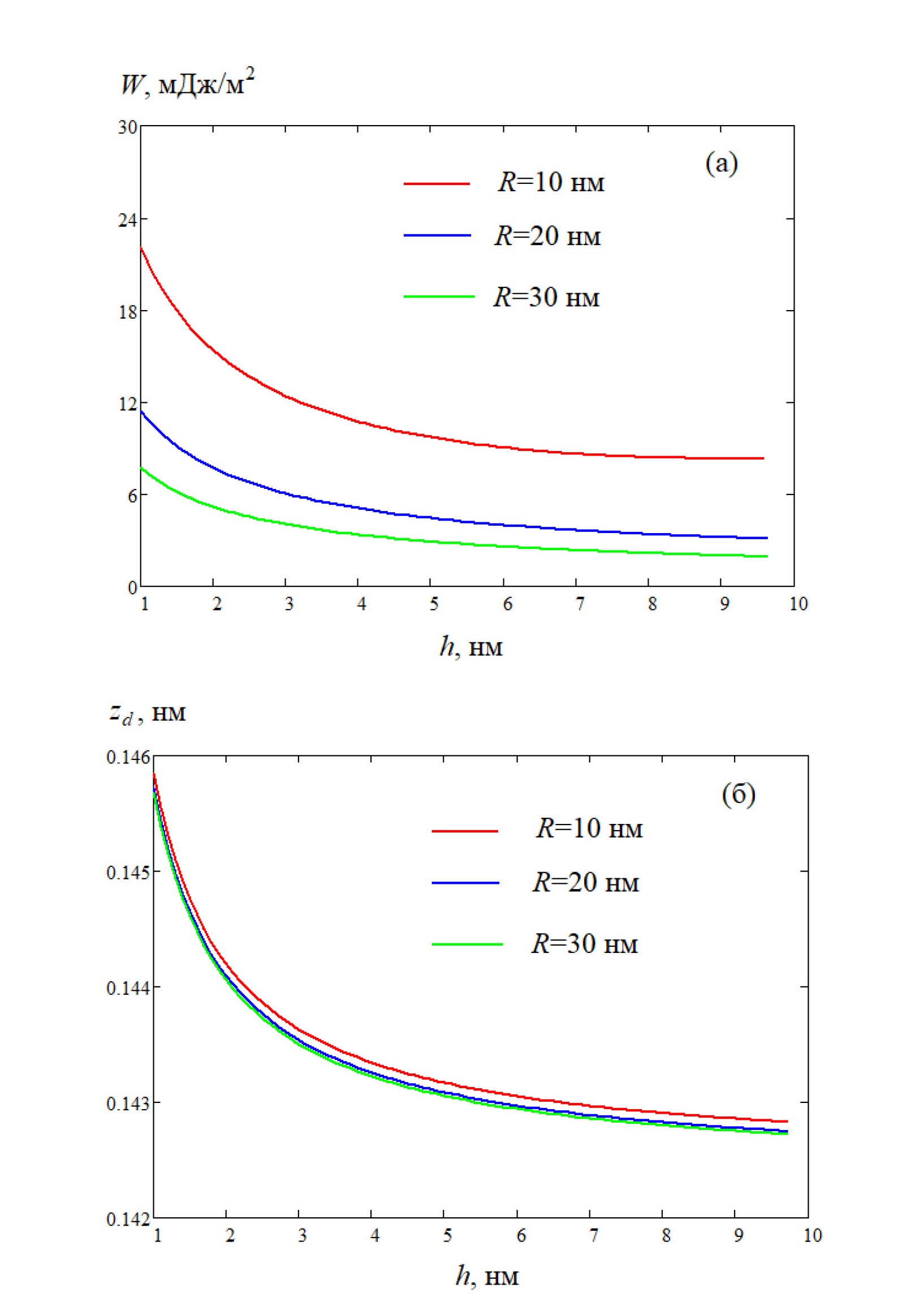 Рис. 2. Зависимость удельной работы адгезии (а) и равновесного расстояния (б) для свинцовой капли на железной подложке от высоты капли при различных значениях радиуса.