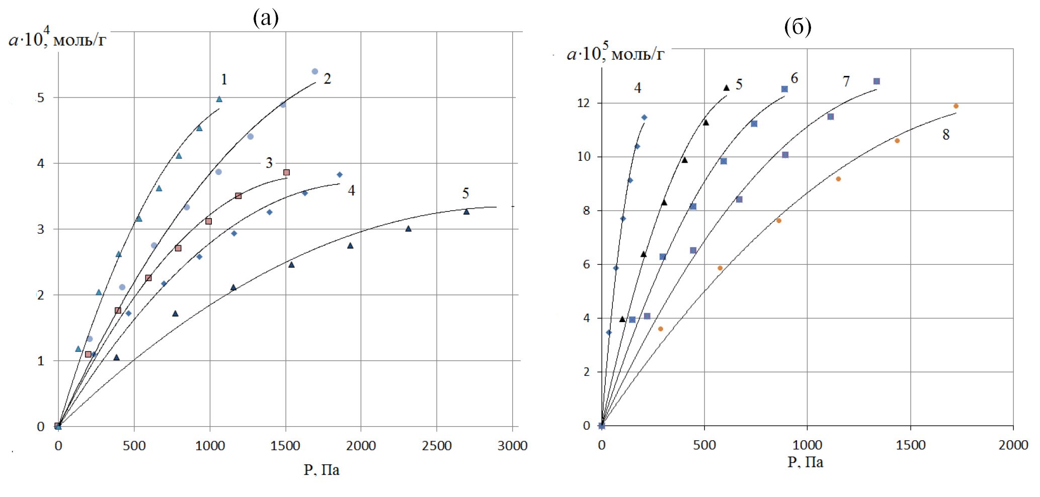 Рис. 1. Изотермы адсорбции воды (а) и гептана (б) на НА при различных температурах: 1 – 40°, 2 – 50°, 3 – 60°, 4 – 80°, 5 – 100°, 6 – 120°, 7 – 130°, 8 – 140°C.