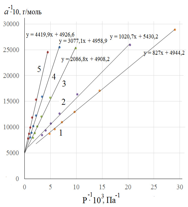 При всех исследованных температурах опытные данные (точки) ложатся вдоль прямых. При этом из уравнений прямых (они показаны возле соответствующих линий), видно, что точки пересечения с осью ординат близки друг к другу со средним значением 1/a∞ = 5033 г/моль. Это позволило из отрезка на оси ординат и тангенса угла наклона прямых вычислить константы изотермы Лэнгмюра а∞ и b.