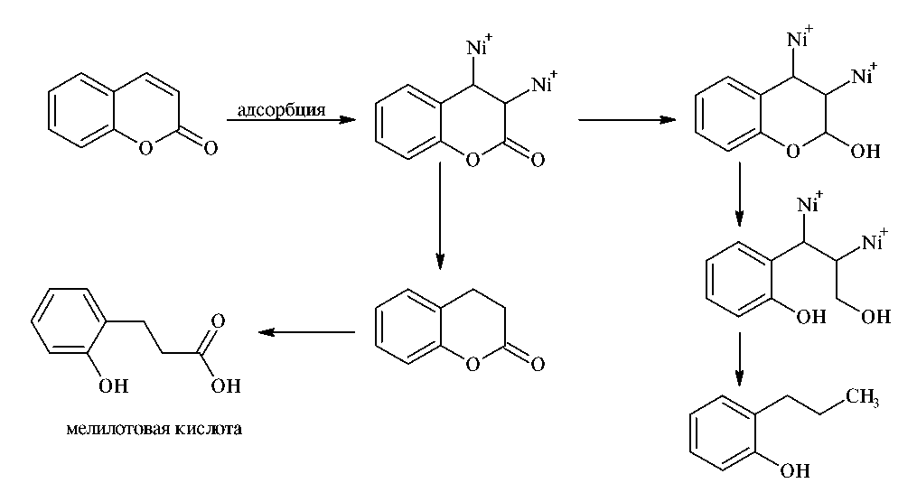 Среди добавок, представленных в таблице, в 60-ые годы важное место занимал кумарин, который, наряду с блескообразованием, обладает высоким выравнивающим эффектом. Однако, учитывая данные работы [132], в которой исследованы продукты электровосстановления кумарина в ходе процесса, в том числе, образование мелилотовой кислоты (рис. 1), присутствие которой снижает блеск и ухудшает качество покрытия за счет более прочной адсорбции на никелевой поверхности, кумарин исключен из рецептур блестящего никелирования.