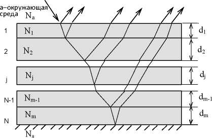 Рис. 1. Оптическая модель неоднородного оксидного слоя на коллекторе: a – окружающая среда, s – подложка (металл коллектор), m – общее количество подслоев, d – толщина j – го подслоя, Nj – комплексный показатель преломления j- го подслоя