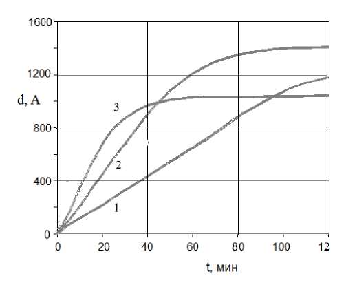 Рис. 2. Изменения толщины оксида D на железе при 300С и парциальном давлении кислорода в системе Р: 1 – 0.001 Торр, 2 – 0.01 Торр, 3 – 0.1 Торр