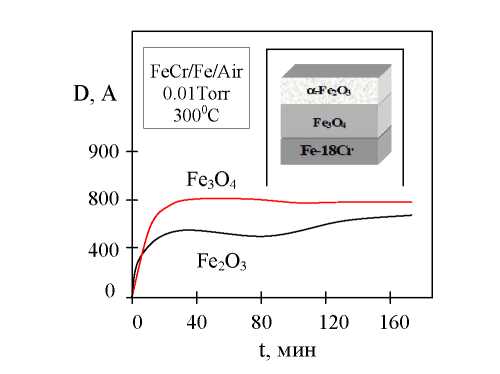 Было показано, что при активированном окислении при степени вакуумирования 0.01 Torr, на поверхности железа начально происходит быстрый рост слоя магнетита Fe3O4 и поверх него – гораздо более тонкого слоя гематита. На последующей стадии общая скорость окисления со временем сильно падает (рис. 2,3). Данный эффект очевидно связан с быстрым зарождением, зародышеобразованием, распространением и ростом островков гематита -Fe2O3 на внешнем слое магнетита. Поверхность, через которую может идти ускоренный рост магнетита, сокращается и сокращается общая скорость окисления. В конце концов тонкая сплошная пленка плотно упакованных кристаллитов -Fe2O3 блокирует поверхность магнетита и металла от дальнейшего ускоренного окисления.