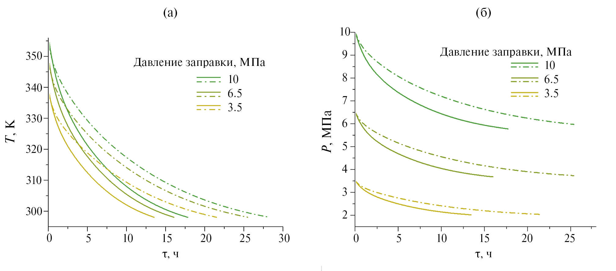 Представленная система уравнений (11)-(13) решалась с использованием последовательных приближений на каждом временном шаге, размер которого определялся пропорционально скорости протекающих процессов (удельный расход газа при заправке и выдаче, перепад температур при стабилизации параметров P и T), а также с учетом коэффициента теплообмена с внешней средой для обеспечения пренебрежимо малой математической погрешности в процессе вычислений.
