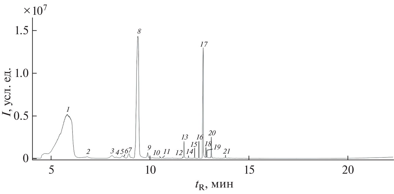 A domestic composite material based on silicon carbide and nitrile butadiene rubber was used to identify volatile substances of banana, banana flavor, and creamy chewing candies by passive adsorption in combination with thermal desorption GC–MS. This method can be used to determine a wide range of compounds, for example, esters of carboxylic acids, terpenoids, aldehydes, aromatic hydrocarbons, alkanes, heterocyclic compounds, phenols, glycerides, and fatty acids. The obtained chromatographic profiles of the samples were compared. In the chromatogram of “Banana” flavor, five peaks (out of eight) corresponded to the compounds that form the aroma of a banana, and in the chromatogram of “Love is” candies with banana flavor, three corresponding peaks (out of 21) were found.