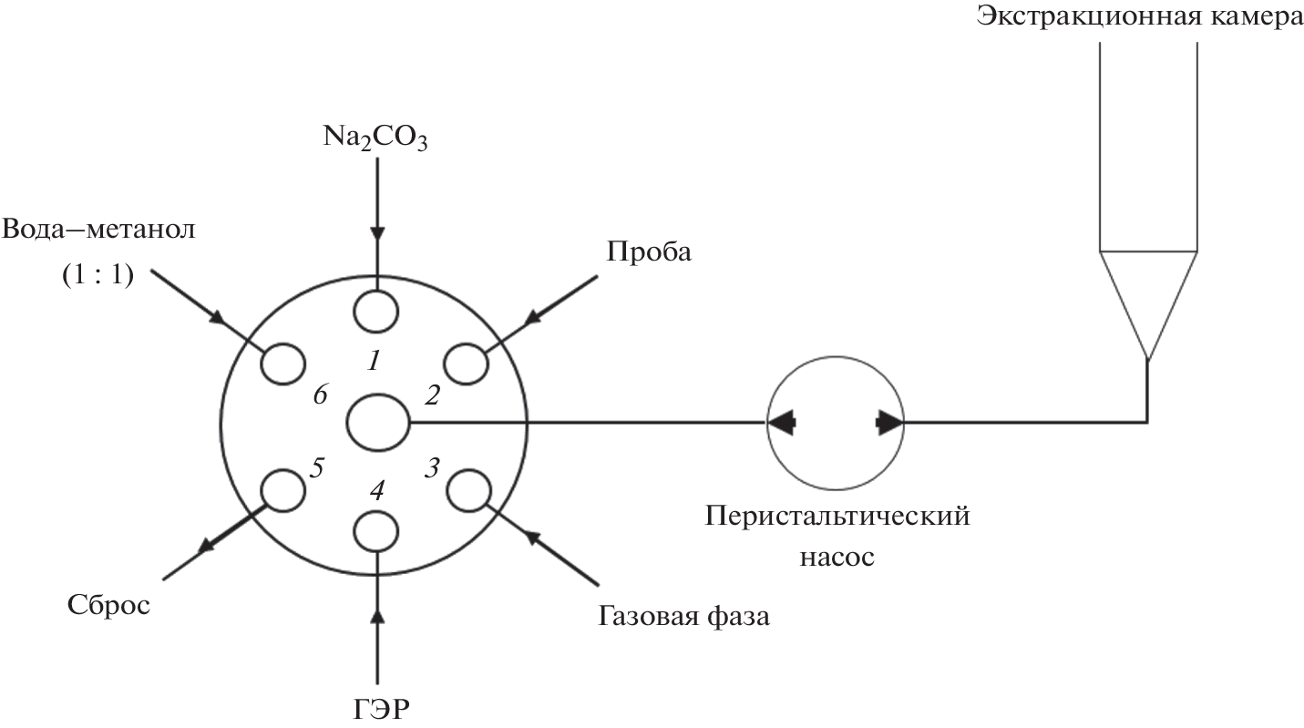 An automated method is developed for dispersive liquid–liquid microextraction of fluoroquinolone antibiotics based on the principles of stepwise injection analysis. The method involves the dispersion of the extractant by the gas phase, formed in situ in the extraction chamber of the flow analyzer. A deep eutectic solvent based on a terpenoid and a mixture of hydrophilic and hydrophobic carboxylic acids is studied as an extractant for the isolation and preconcentration of fluoroquinolones, and a possibility of its use is substantiated. Hydrophilic carboxylic acid in the composition of the extractant acts as a proton donor for the formation of a carbon dioxide dispersant in the presence of sodium carbonate dissolved in the aqueous phase. A possibility of combining the developed method with high-performance liquid chromatography with fluorimetric detection is shown on an example of the determination of fluoroquinolones in wastewaters. The limits of detection (3σ) for ofloxacin, fleroxacin, and norfloxacin were 0.3 µg/L.