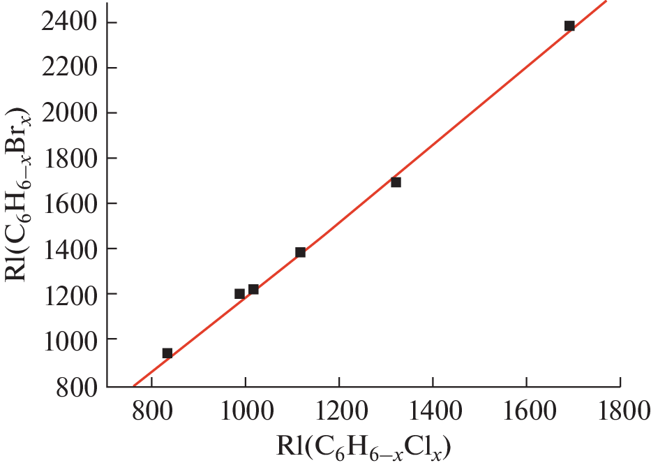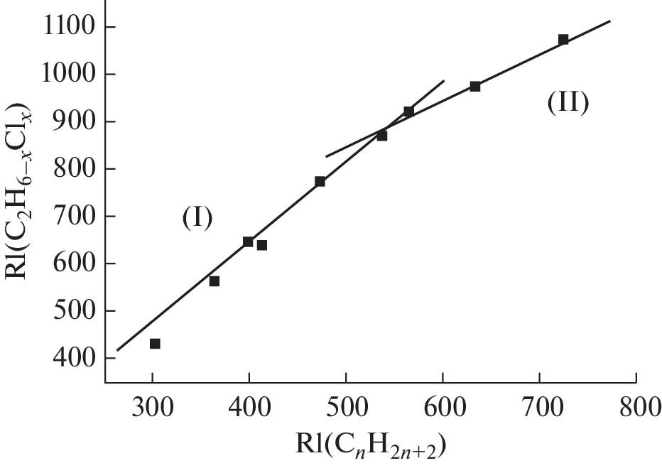 in one of the groups with the presence of extrema in the other group is an unequivocal sign of the absence of a linear correlation between retention indices. If the values of