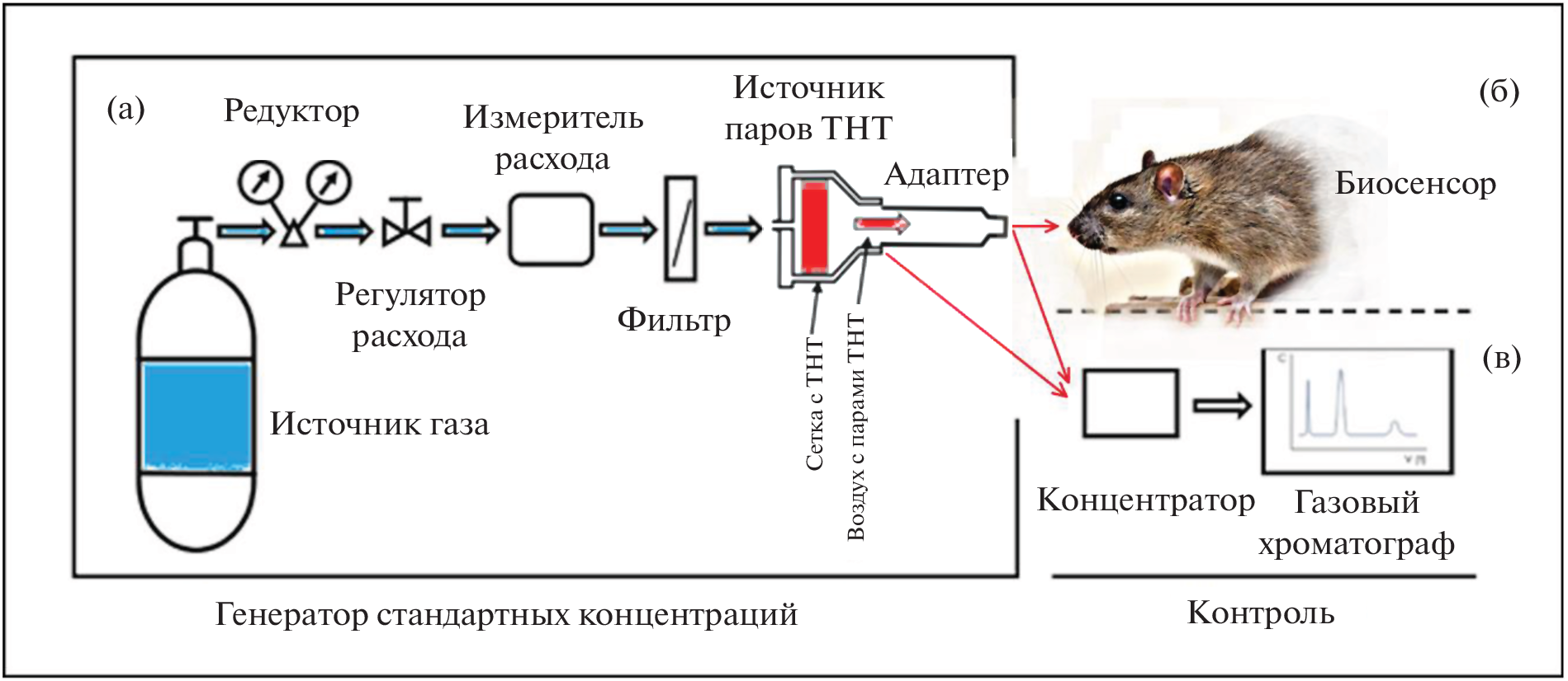 The technology is based on recording the focal activity (FA) of the olfactory bulb (OB) of rats upon the exposure rats to trinitrotoluene (TNT) vapors in the concentration 4.7 × 10–15 g/cm3, separately and in a mixture with saturated vapors of a complex interference composed of spices. The focal activity of the rat olfactory bulb was recorded using an array of 16 special electrodes implanted in the dorsal part of the rat olfactory bulb. The setup contained a box with a rat, sources of vapors (odorants), a multichannel digital system for recording electrical signals from an electrode array, and software performing algorithms for recognizing and classifying odorants presented to the rat. One source of TNT vapors was a device for batch volumetric preparation with a concentration of about 10–15 g/cm3, and another source was a source with a concentration of 4.7 × 10–15 g/cm3 in an air flow presented to rats. Data from 25 tests showed a 100% probability of detecting TNT vapors of the specified concentrations in pure air and also in the presence of a complex odor interference in the form of vapors from a mixture of red pepper, coriander, tobacco, etc., which, as a rule, mask the smell of TNT for animals.The technology is based on recording the focal activity (FA) of the olfactory bulb (OB) of rats upon the exposure rats to trinitrotoluene (TNT) vapors in the concentration 4.7 × 10–15 g/cm3, separately and in a mixture with saturated vapors of a complex interference composed of spices. The focal activity of the rat olfactory bulb was recorded using an array of 16 special electrodes implanted in the dorsal part of the rat olfactory bulb. The setup contained a box with a rat, sources of vapors (odorants), a multichannel digital system for recording electrical signals from an electrode array, and software performing algorithms for recognizing and classifying odorants presented to the rat. One source of TNT vapors was a device for batch volumetric preparation with a concentration of about 10–15 g/cm3, and another source was a source with a concentration of 4.7 × 10–15 g/cm3 in an air flow presented to rats. Data from 25 tests showed a 100% probability of detecting TNT vapors of the specified concentrations in pure air and also in the presence of a complex odor interference in the form of vapors from a mixture of red pepper, coriander, tobacco, etc., which, as a rule, mask the smell of TNT for animals.