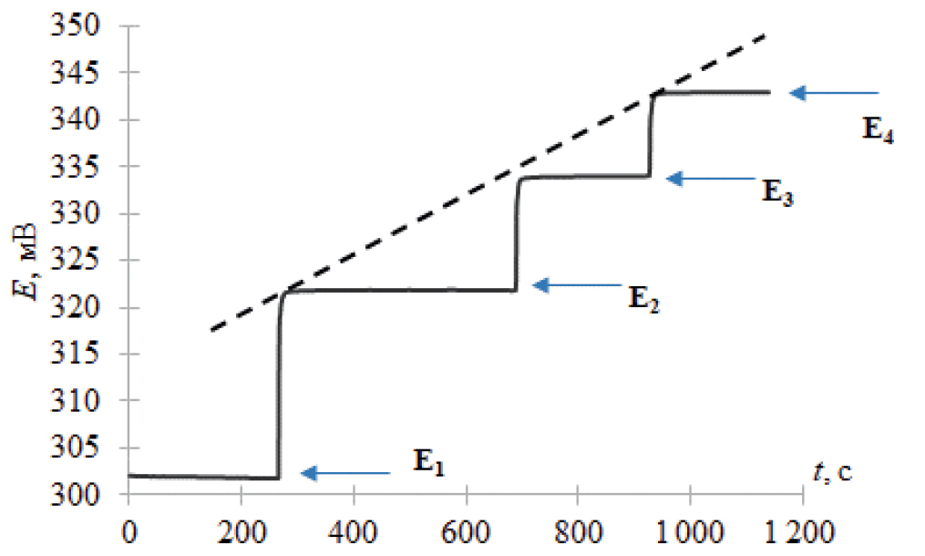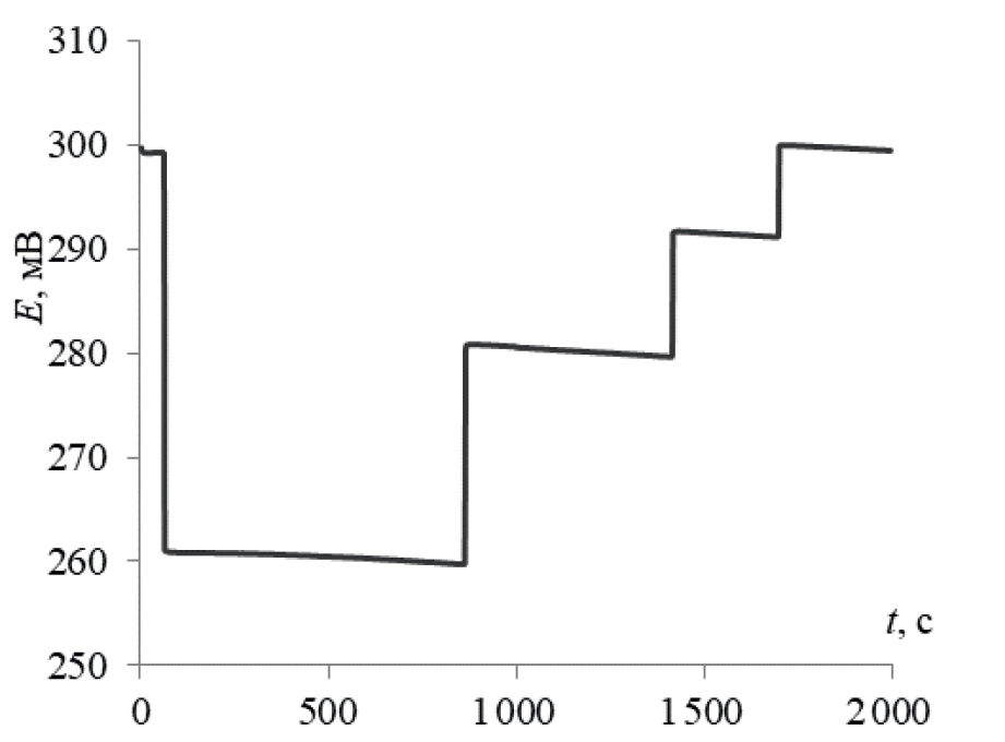 Для реализации предложенного подхода после взаимодействия исследуемого образца с системой гексацианоферратов вводили серию последовательных добавок K3[Fe(CN)6] и фиксировали значения потенциалов Е3–Е5. На рис. 3 представлена зависимость потенциала от времени. Построенная на фоне исследуемого образца градуировочная зависимость потенциала от логарифма соотношения концентраций K3[Fe(CN)6]/K4[Fe(CN)6] имеет линейный вид
