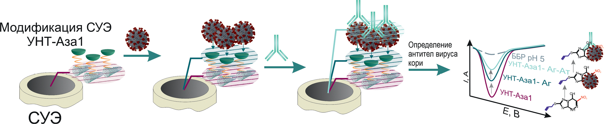 В рамках нашего исследования получили гибридный наноразмерный модификатор состава – многостенные углеродные нанотрубки-Аза1 для последующей иммобилизации на его поверхности антигена вируса кори. На КВВ, зарегистрированных с использованием модифицированного полученным гибридным наноматериалом СУЭ (рис. 4), присутствует выраженный катодный пик в области потенциалов электровосстановления нитрогруппы, что указывает на эффективность проведенной иммобилизации.