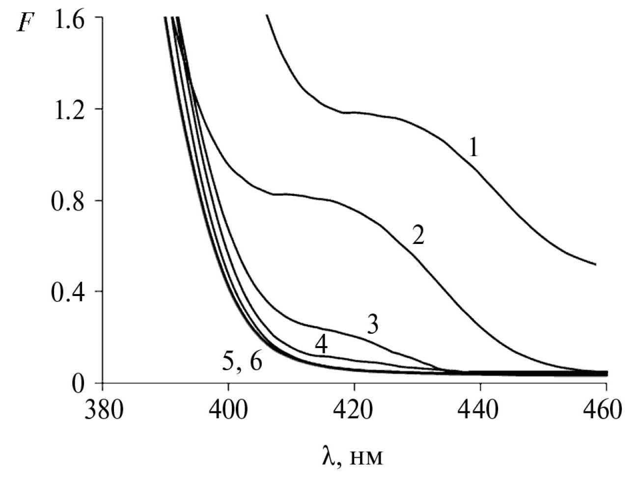 Рис. 1. Спектры диффузного отражения в виде функции Гуревича – Кубелки – Мунка для систем цефалоспорин–иммобилизованный пара-диметиламинобензальдегид (ДМАБ). 1 – цефотаксим, 2 – цефалексин, 3 – цефуроксим, 4 – цефазолин, 5 – цефтриаксон, 6 – ДМАБ; 95 оC, 15 мин, 0.1 М НСl.