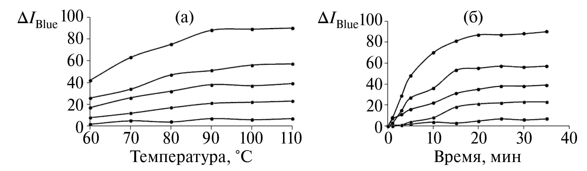 Цветометрически исследовали влияние температуры и продолжительности реакции цефалоспоринов с иммобилизованным ДМАБ (рис. 2). Как видно из рисунка, для исследуемых систем через ~20–25 мин при 90 оC значения ∆IBlue максимальны, а тест-средства имеют наиболее интенсивную окраску.