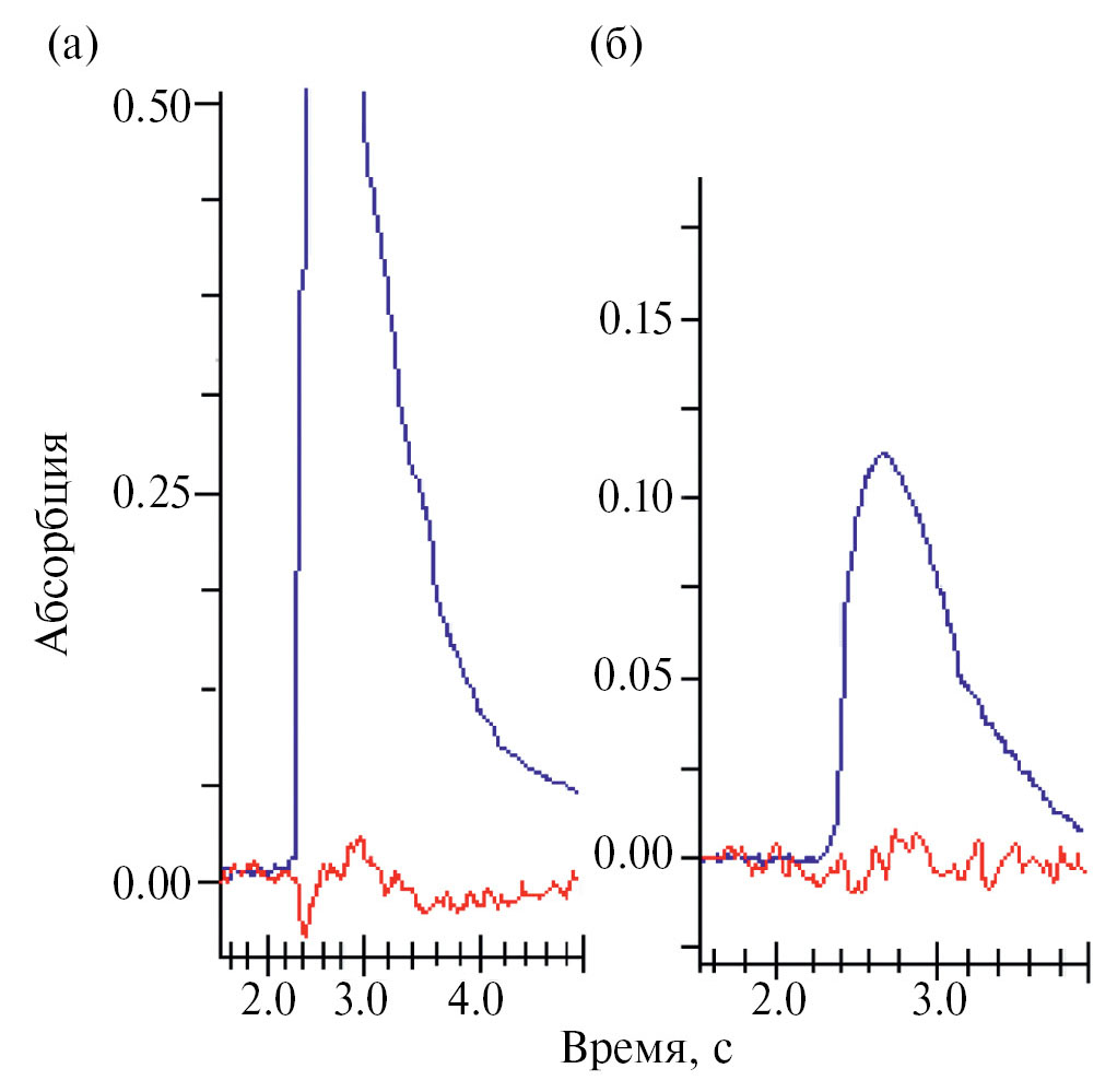 Рис. 2. Аналитические сигналы Ni (а) и Cr (б) в присутствии морской воды (дозировка 10 мкл): абсорбция (красный цвет) и фоновый сигнал (синий цвет).