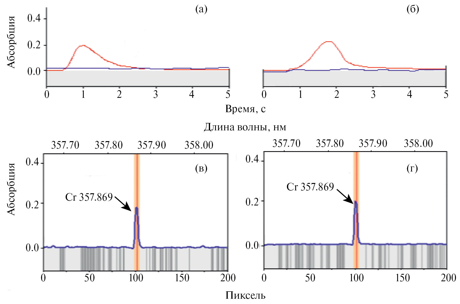 Рис. 4. Аналитический сигнал хрома: (а), (в) – стандартный раствор с концентрацией 10 мкг/л; (б), (г) – морская вода с добавкой 10 мкг/л аналита; дозировка 10 мкл. Абсорбция (красный цвет) и фоновый сигнал (синий цвет).