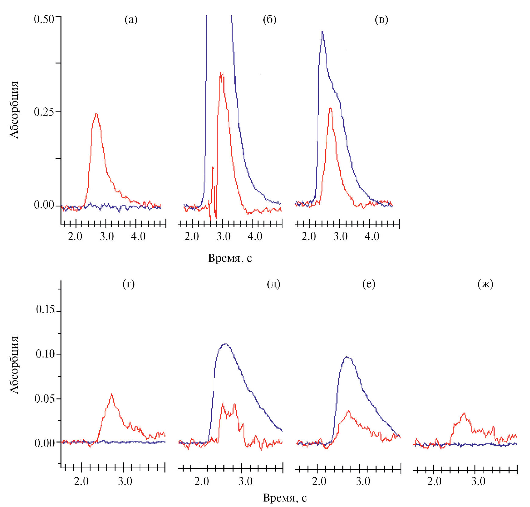 Рис. 5. Аналитические сигналы никеля ((а) – стандартный раствор с концентрацией 50 мкг/л, tпир = 1000 оC; (б) – морская вода с добавкой 50 мкг/л аналита, tпир = 1000 оC; (в) – морская вода с добавкой 50 мкг/л, tпир = 1200 оC) и хрома ((г) – стандартный раствор с концентрацией 5 мкг/л, tпир = 1300 оC; (д) – морская вода с добавкой 5 мкг/л аналита, tпир = 1300 оC; (е) – морская вода с добавкой 5 мкг/л аналита, tпир = 1400 оC; (ж) – стандартный раствор с концентрацией 5 мкг/л, tпир = 1400 оC): абсорбция (красный цвет) и фоновый сигнал (синий цвет), дозировка всегда 10 мкл.