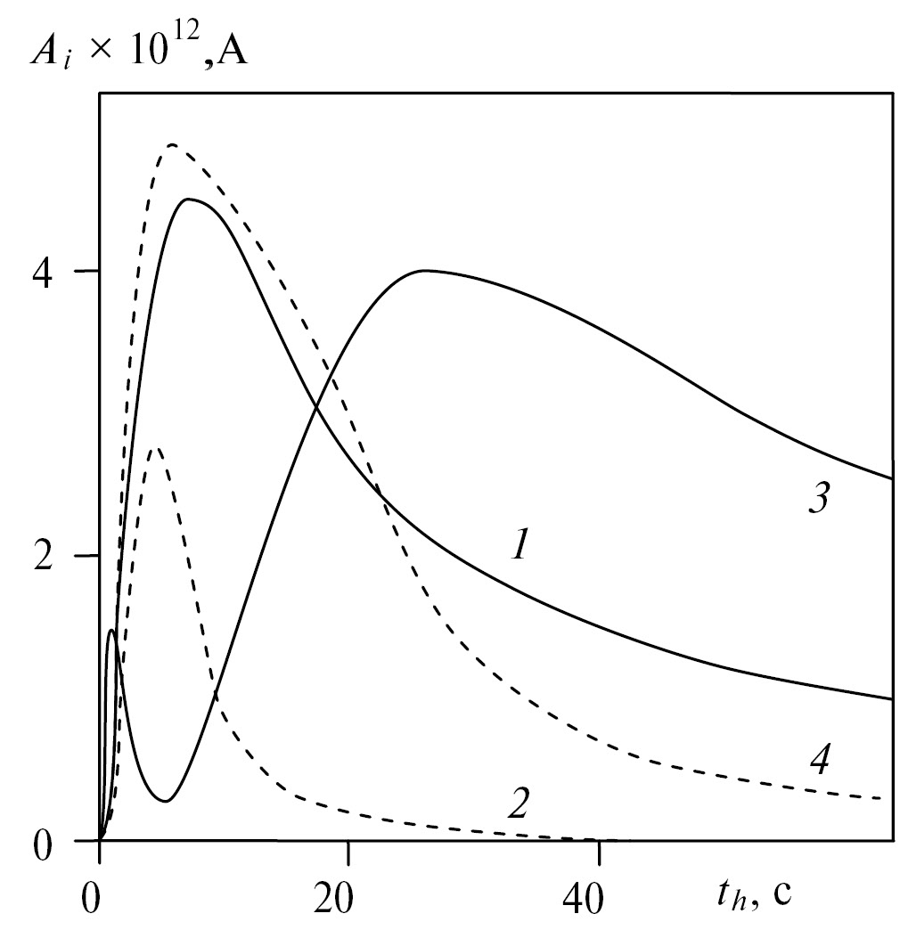 Рис. 2. Зависимости амплитуды ионных пиков яблочной кислоты от времени пребывания в камере термодесорбции Ai (th) салфетки, содержащей это вещество массой: 0.1 мкг (1) и (2); 0.4 мкг (3) и (4). Ионы приведенной подвижностью K0 = 1.85 и 1.29 см2/(В·с) – сплошная и пунктирная линии соответственно.