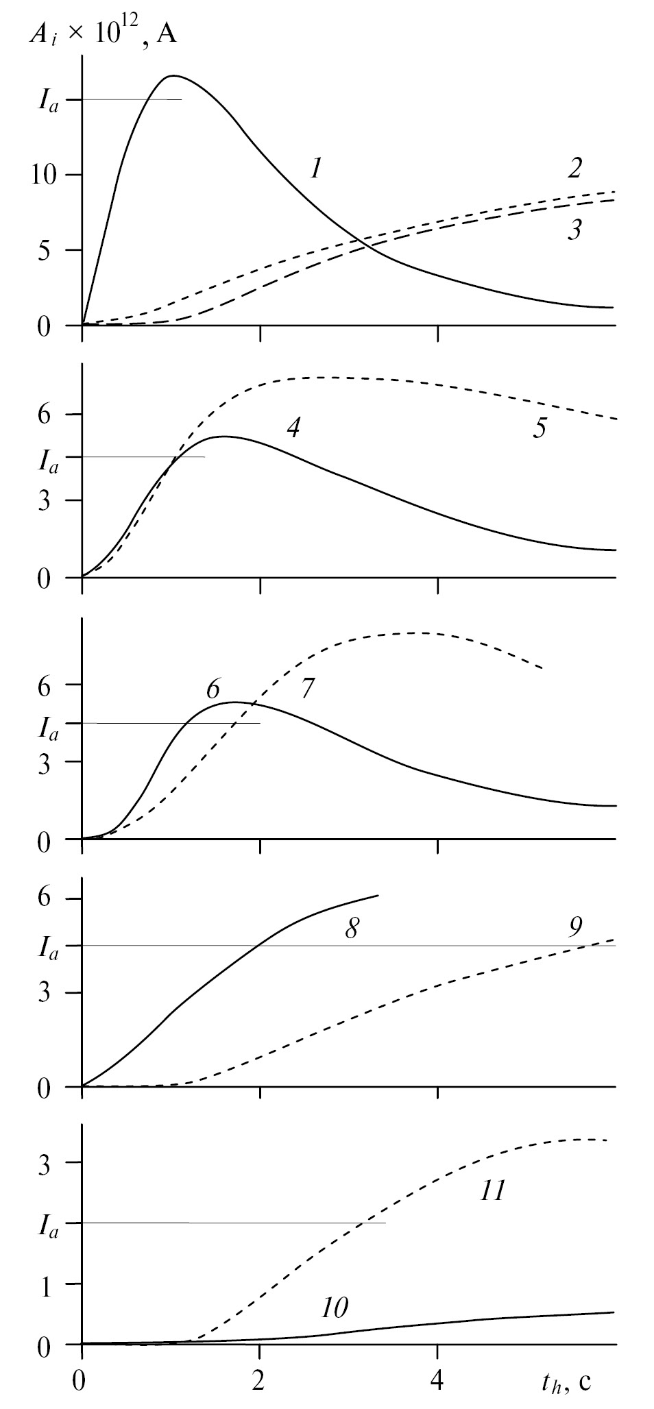 Рис. 3. Зависимость амплитуды ионных пиков веществ от времени пребывания салфетки с пробой в камере термодесорбции Ai (th): (а) 4 нг 2,4-динитротолуола (1), 1 мкг аскорбиновой (2) и 1 мкг лимонной кислот (3) (K0 = 1.60−1.61 см2/(В·с)); (б) 0.5 нг 2,4,6-тринитротолуола (4) и смеси 0.2 мкг щавелевой и 0.2 мкг яблочной кислот (5) (K0 = 1.47 см2/(В·с)); (в) 5 нг 1,2,3-тринитроксипропана (6) и 0.2 мкг яблочной кислоты (7) (K0 = 1.29 см2/(В·с)); (г) 1 нг гексогена в отпечатке пальца (8) и смеси 0.3 мкг лимонной и 0.3 мкг яблочной кислот (9) (K0 = 1.21 см2/(В·с)); (д) 10 мкг октогена (10) и 0.15 мкг винной кислоты (11) (K0 = 1.24 см2/(В·с)). Сплошная линия – взрывчатые вещества, пунктир – органические кислоты. Ia – указанные в экспериментальной части уровни срабатывания сигнала “тревога” для соответствующих взрывчатых веществ.