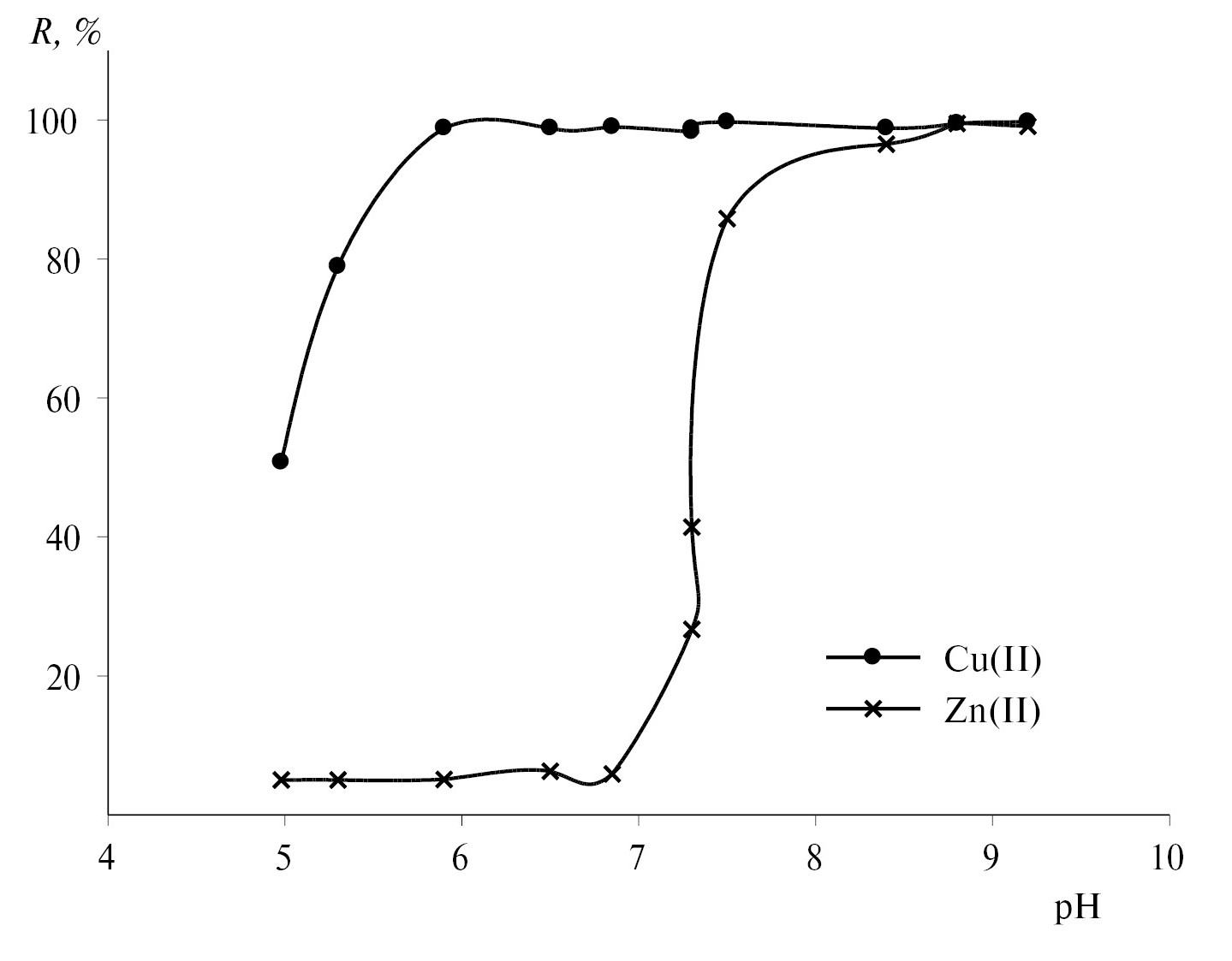 Рис. 4 иллюстрирует коллективную флотацию меди и цинка; в табл. 4 представлены коэффициенты распределения и разделения данной пары металлов. Селективное извлечение ионов Cu(II) возможно в интервале значений рН 5.8–7.0; при этом максимальная степень извлечения Cu(II) составила 99.7%.