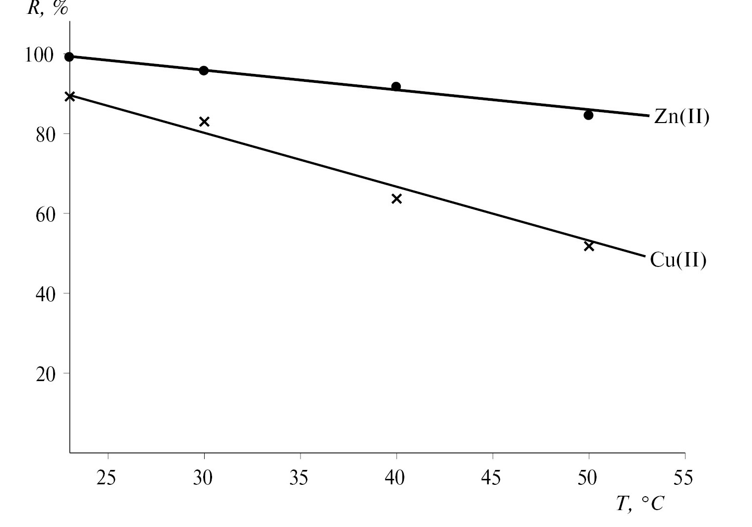 Рис. 7. Влияние температуры на степень флотационного извлечения ионов Zn(II) и Cu(II). cМе(II)(исх), мг/л: Cu – 46.1, Zn – 42.2; [Zn] : [НМГ] = 1 : 1, [Cu] : [НМГ] = 1 : 2; τконд, мин: Zn – 30, Cu – 10; τфл, мин: Zn – 10, Cu – 10.