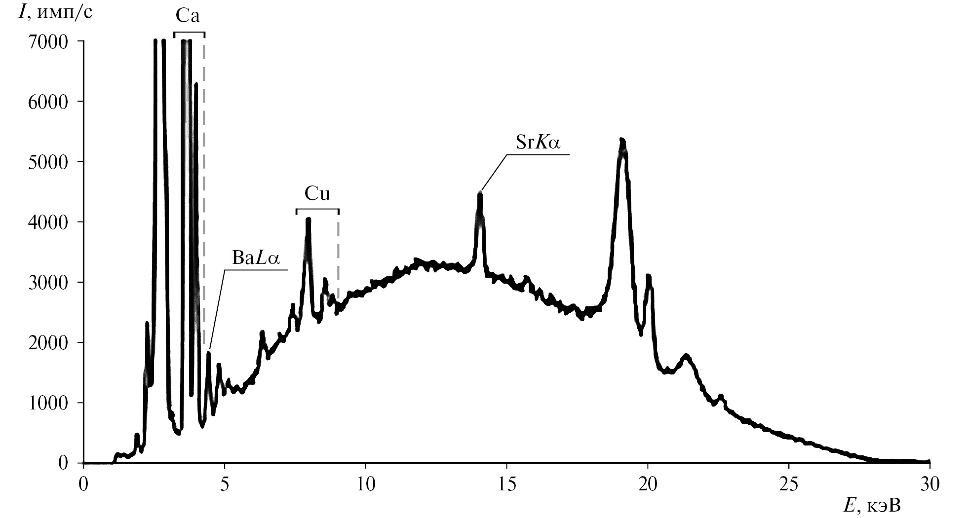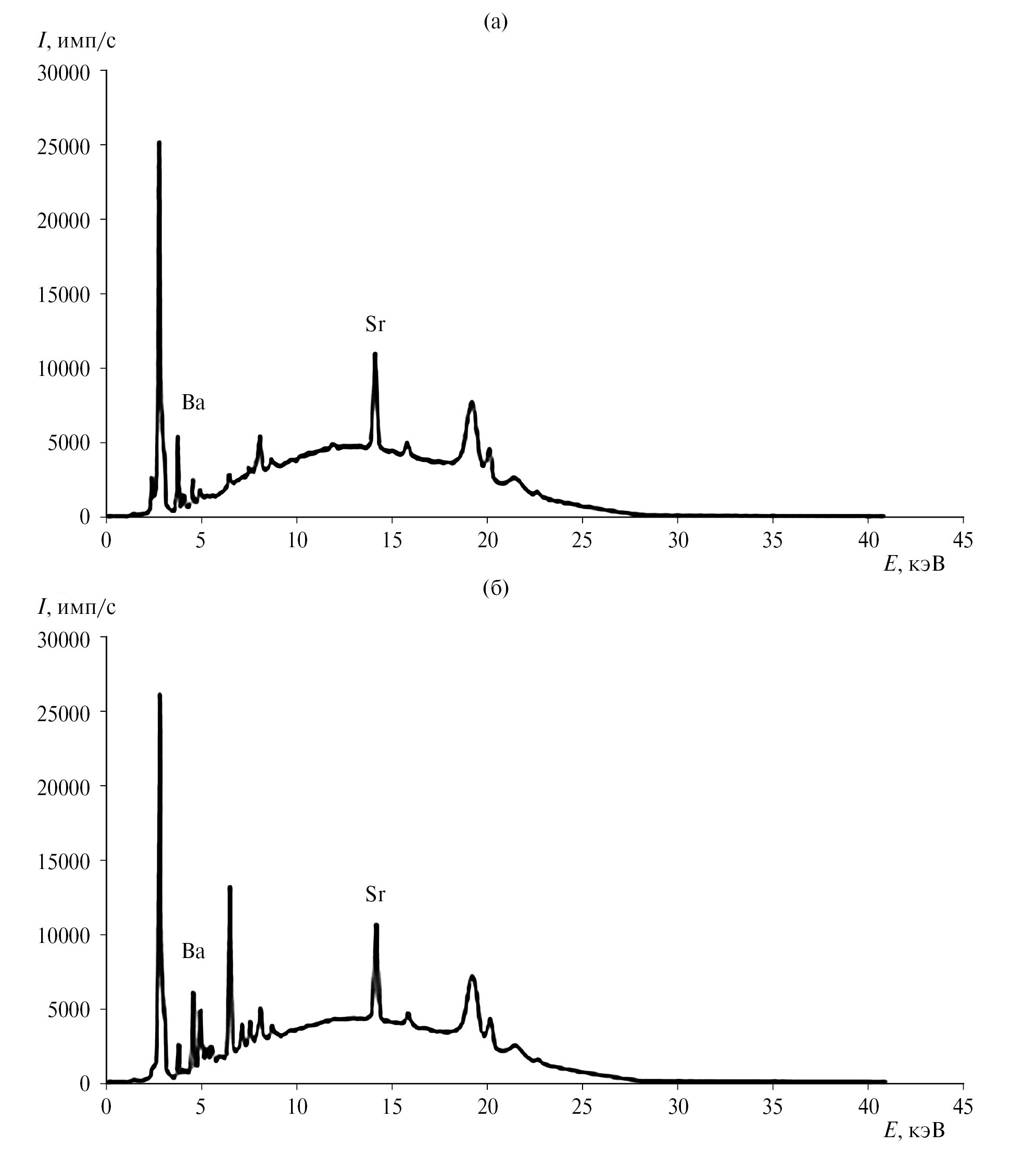 Оборудование. РФА-измерения выполняли на рентгенофлуоресцентном энергодисперсионном спектрометре EDX3600 (Skyray, США). Параметры: напряжение 40 кВ, ток 1000 мА, время экспозиции 40 с. Работали с наиболее чувствительными спектральными линиями элементов К-серии для стронция и L-серии для бария [26].