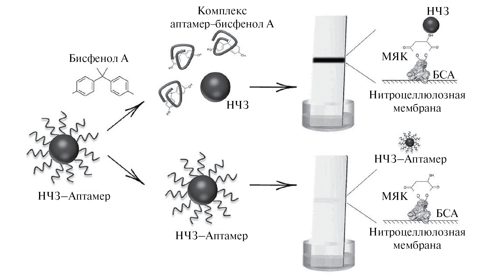 Принцип определения бисфенола А. Принцип работы тест-системы основан на специфическом связывании аптамера и бисфенола А, сопровождающемся его десорбцией [29, 30] с поверхности наночастиц золота. Отсутствие молекул аптамера на металлической поверхности приводит к захвату свободных наночастиц золота конъюгатом БСА–МЯК, адсорбированным в тестовой зоне нитроцеллюлозной мембраны (рис. 1). В качестве детектирующиего агента выбрана меркаптоянтарная кислота, обеспечивающая накопление НЧЗ в тестовой зоне из-за высокоаффинного связывания тиоловых групп с поверхностью НЧЗ. Стабилизированные цитратом НЧЗ предварительно конъюгировали с аптамером, связывающим бисфенол А, что предотвращает захват наночастиц в тестовой зоне в отсутствие целевого аналита. Тест-полоски погружали в раствор, содержащий бисфенол А и конъюгат НЧЗ с аптамером, инкубация которых иниицирует изменение конформации аптамера при образовании комплекса с бисфенолом А. После удаления аптамера с поверхности НЧЗ, двигаясь по мембране, захватываются в тестовой зоне конъюгатом БСА–МЯК, что приводит к ее окрашиванию. В отсутствие бисфенола А модифицированные аптамером НЧЗ проходят мимо тестовой зоны благодаря стабилизации поверхности наночастиц.