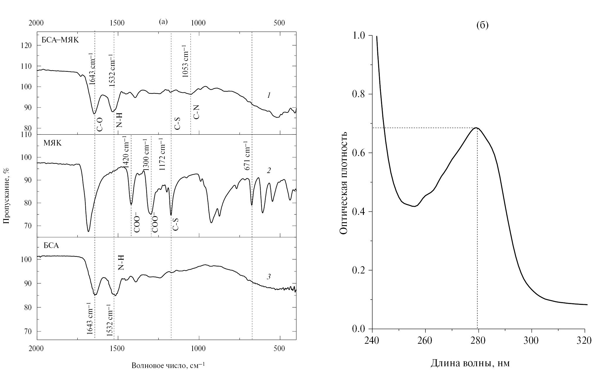 Рис. 2. (а) ИК-спектры бычьего сывороточного альбумина (конъюгата БСА-МЯК) (1), меркаптоянтарной кислоты (МЯК) (2) и бычьего сывороточного альбумина (БСА) (3); (б) спектр поглощения конъюгата БСА−МЯК.